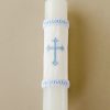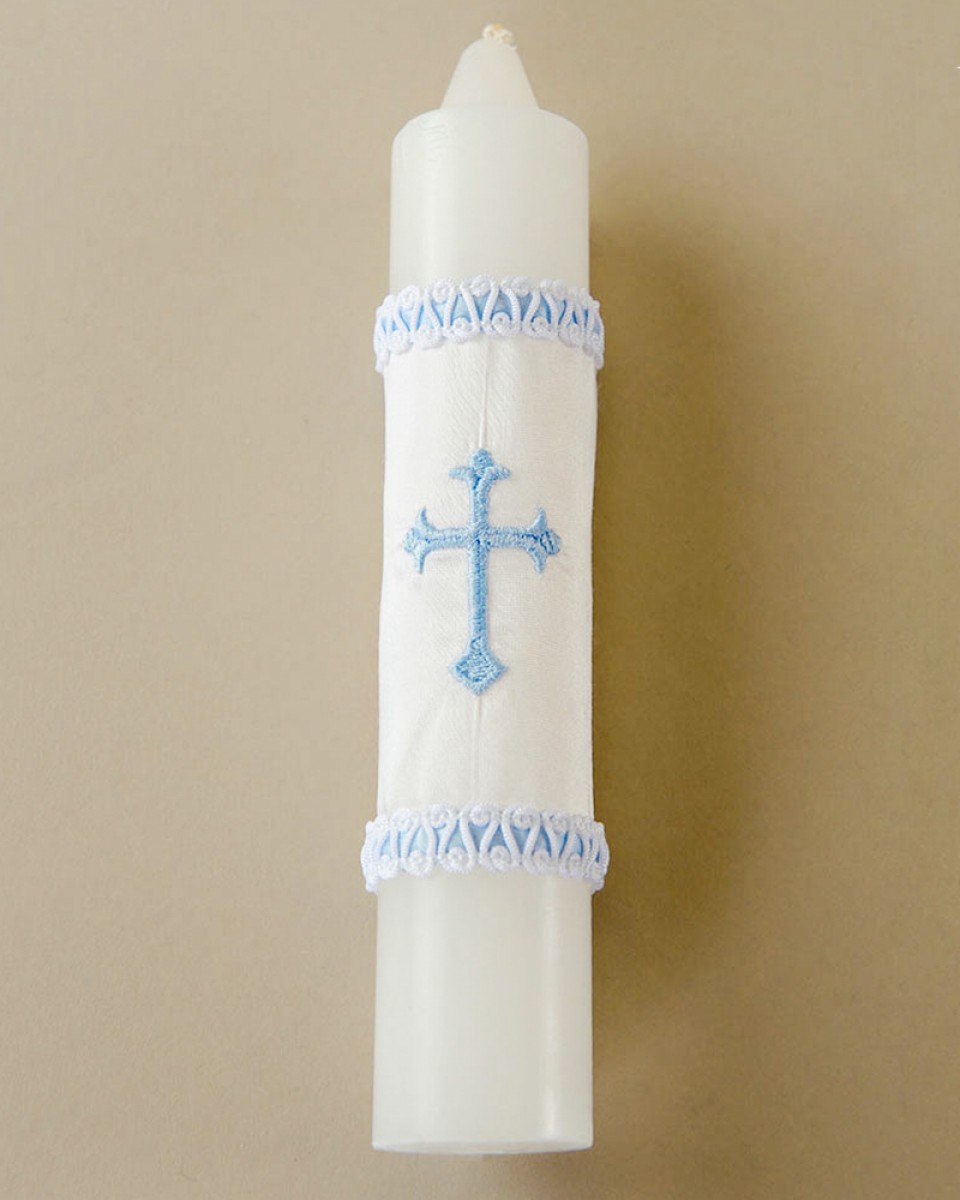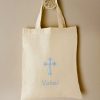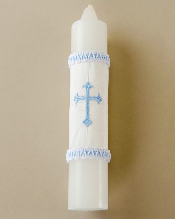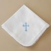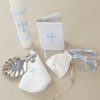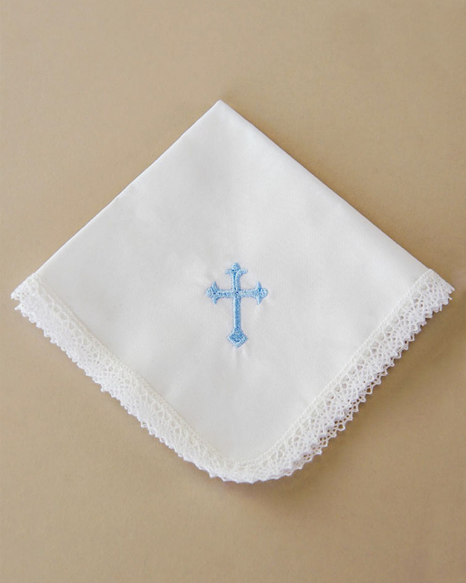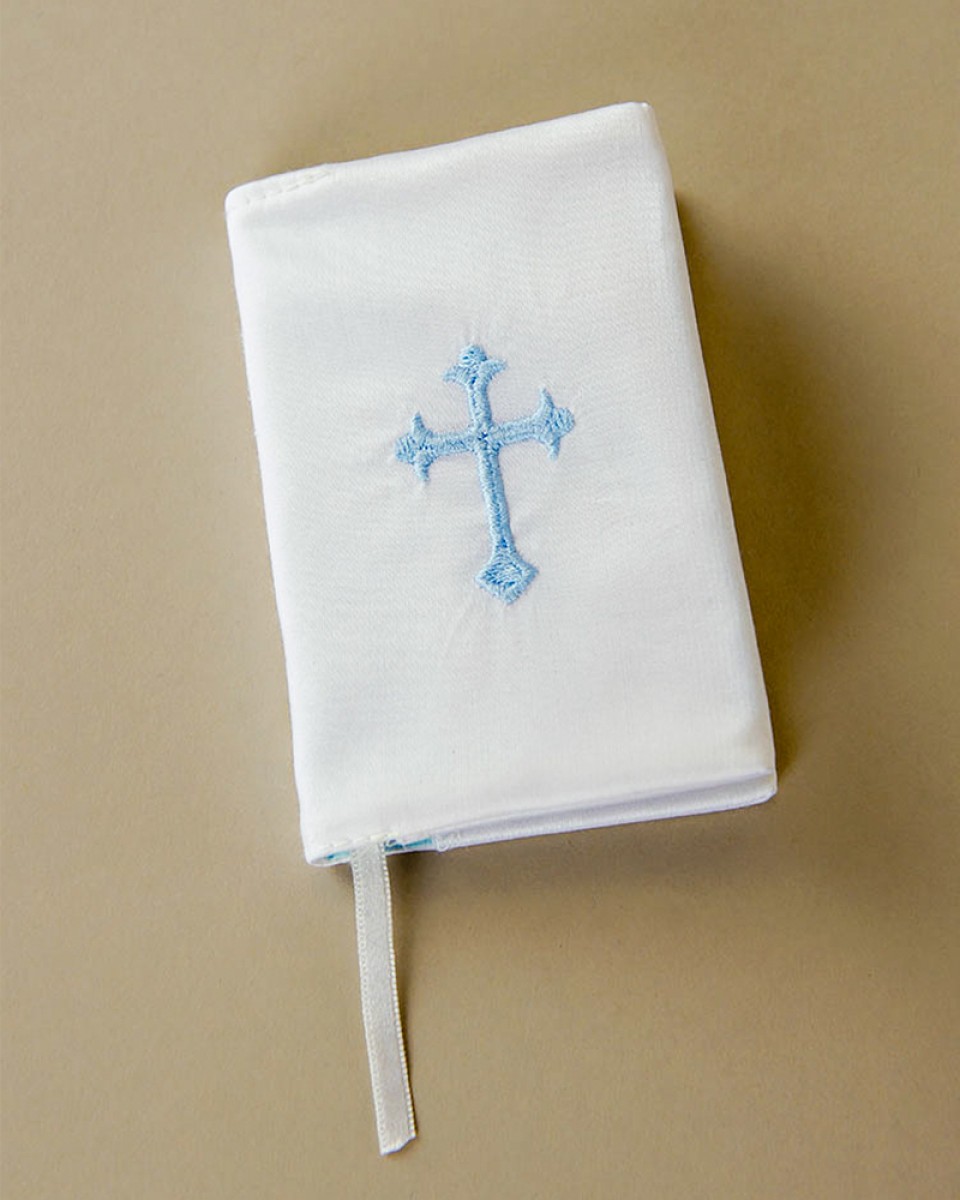 All the accessories you need for a beautiful boy’s christening ceremony, elegantly coordinated with blue cross-embroidered details, presented in a personalized muslin tote bag!