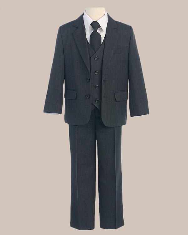 - 5-Piece formal boy’s suit includes Jacket, Pants, Vest, Shirt and Tie