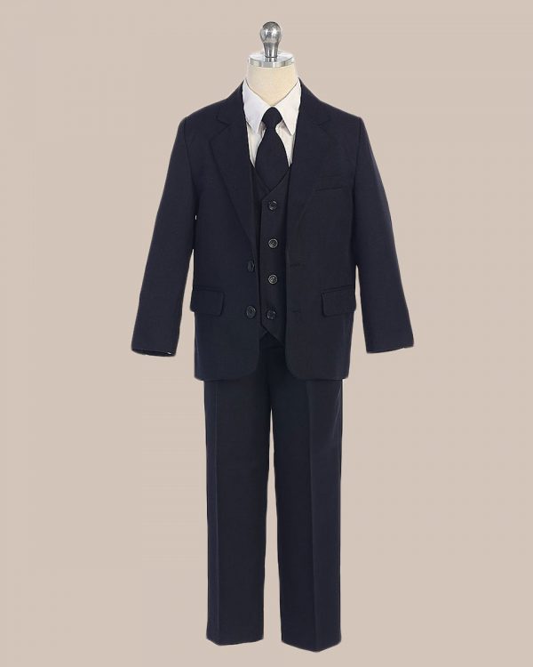 - 5-Piece formal boy’s suit includes Jacket, Pants, Vest, Shirt and Tie