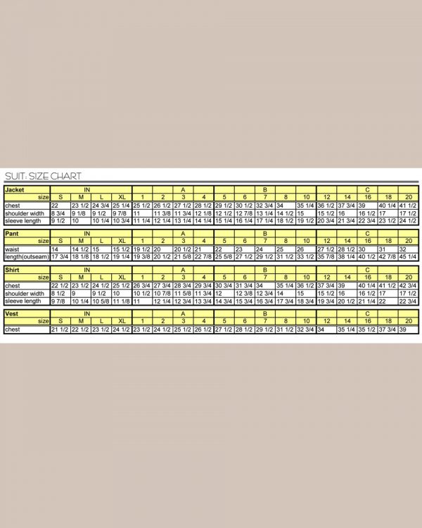 Measurement are in inches. Slight varations in measurements can occur in the manufacturing of each suit.