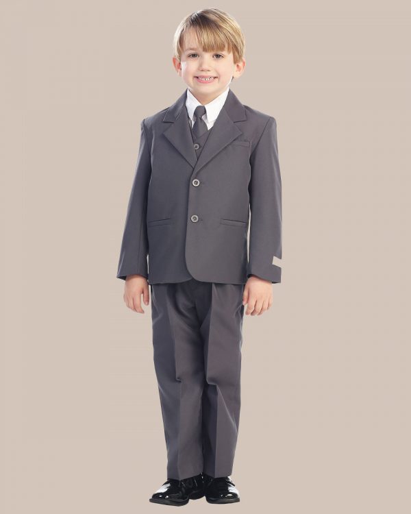 5-Piece formal boy’s suit includes Jacket, Pants, Vest, Shirt, and Tie.