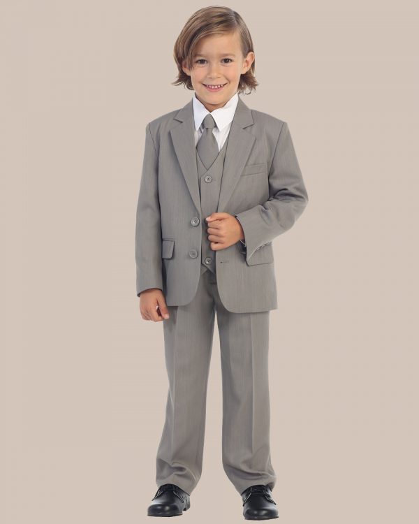 5-Piece formal boy’s suit includes Jacket, Pants, Vest, Shirt and Tie.