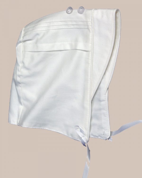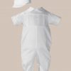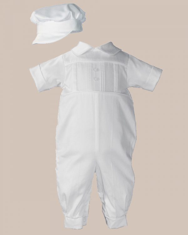 Cotton sateen short sleeve boys coverall outfit with pleated and pin tucked front. This handsome onesie features a collared neckline, pin tucked front with button accents, and a matching captain style hat. 100% Cotton Sateen. Hand wash.