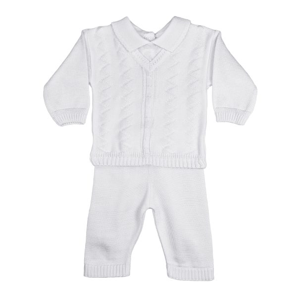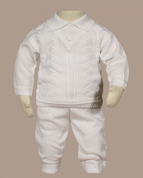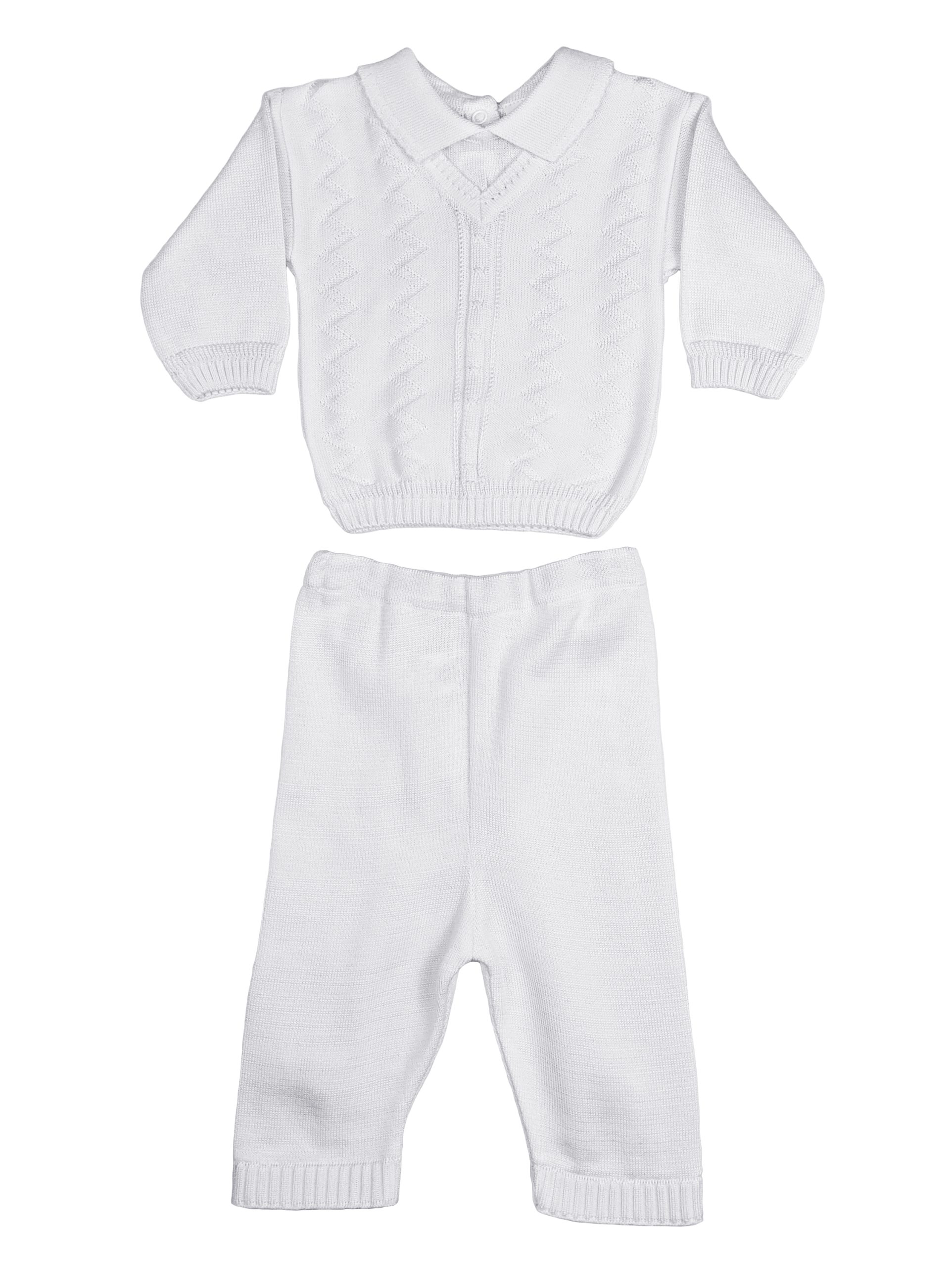 Features knit V-neck sweater with built-in collar and matching knit pants. (CKNIT2)