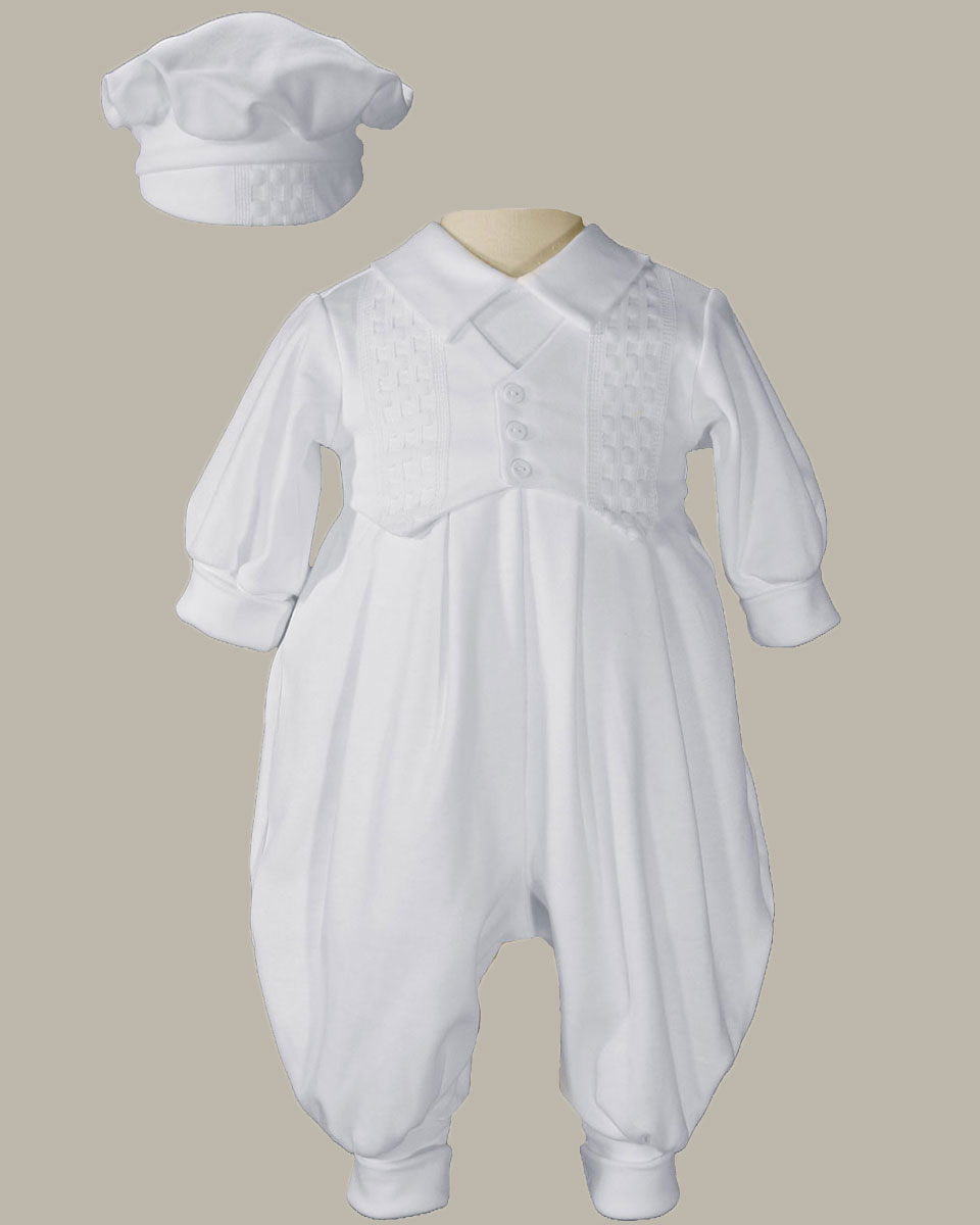 Handsom long sleeve, long pant coverall accented with handsome windowpane trim for a very dressy masculine look. Includes matching hat. Hand wash. Made of ultra soft 100% cotton interlock. Packaged on a beautiful padded hanger. Available in sizes NB (0-3 months), SM (3-6 months), MD (6-9 months) and LG (9-12 months). (WF2351)