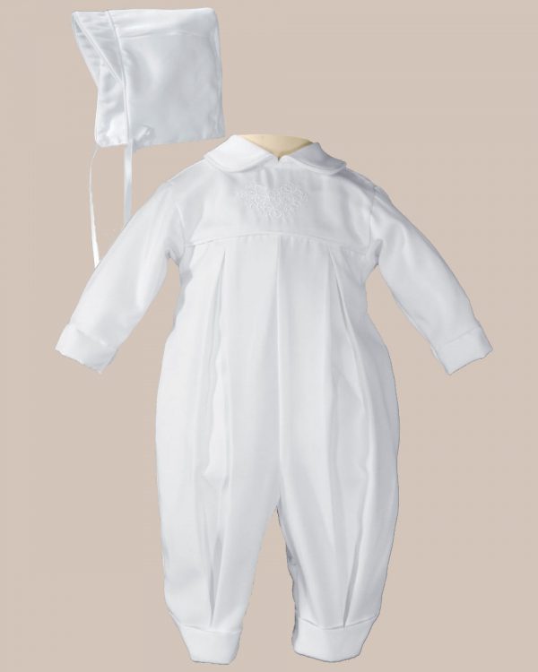 An inverted pleat on each leg of this boys christening outfit gives this style a handsomely distinguished look. Embroidered Shamrock Cluster on bodice. Fabricated of the softest gabardine the simple styling provides luxurious comfort. Includes matching hat. Polyester/Rayon blend. Machine wash. Shipped with elegant padded hanger and zippered vinyl bag. Heirloom Preservation Bag recommended for long-term storage. Available in sizes 3, 6, and 12 month. (GBSH51)