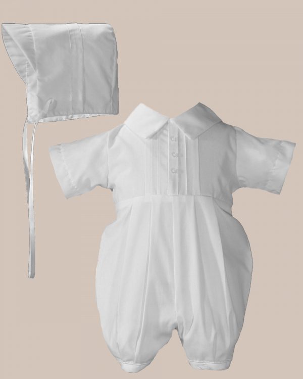 Simple handsome short sleeve polycotton broadcloth christening romper. Features pin tucking and buttons. Includes matching hat. The Little Things Mean a Lot Heirloom Preservation Bag is recommended for long-term storage. This elegant coverall is perfect for Christening, Baptism, Baby Blessing, or any special occasion such as weddings, church presentations, dedications, and keepsake photos. (BJ05RS)