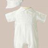 Boyish silk dupioni (slightly off white) christening romper. Includes matching bonnet style hat. 100% Silk. (Please note that all natural silk fabrics have slubs which are an inherent part of the fibers and add to the individuality of the set. These should not be mistaken for flaws in the fabric.) Dry clean. Shipped with elegant padded hanger and zippered vinyl bag. Heirloom Preservation Bag recommended for long term storage. Sizes: 3, 6, 12, 18 and 24 month. (DP31RS) (DP31RH)