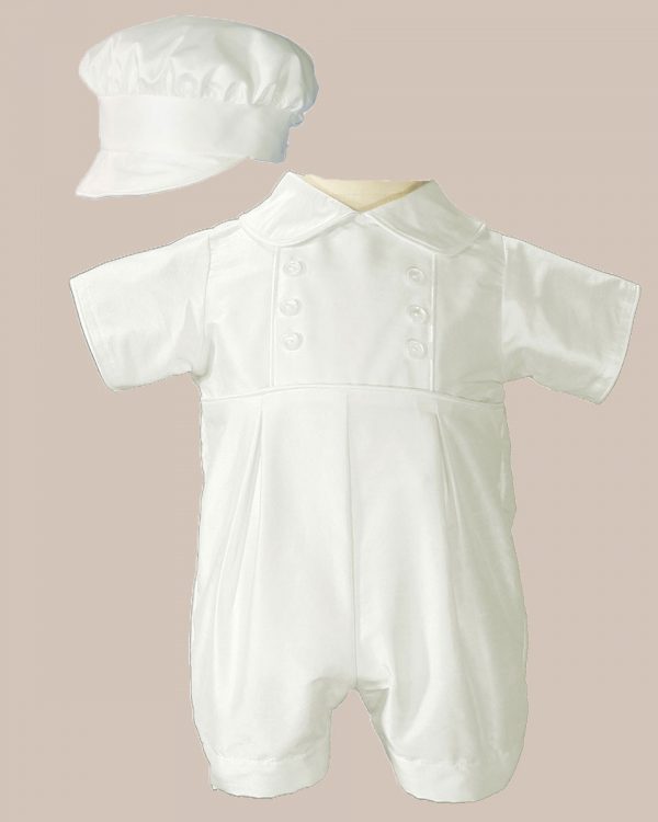Boyish silk dupioni (slightly off white) christening romper. Includes matching bonnet style hat.