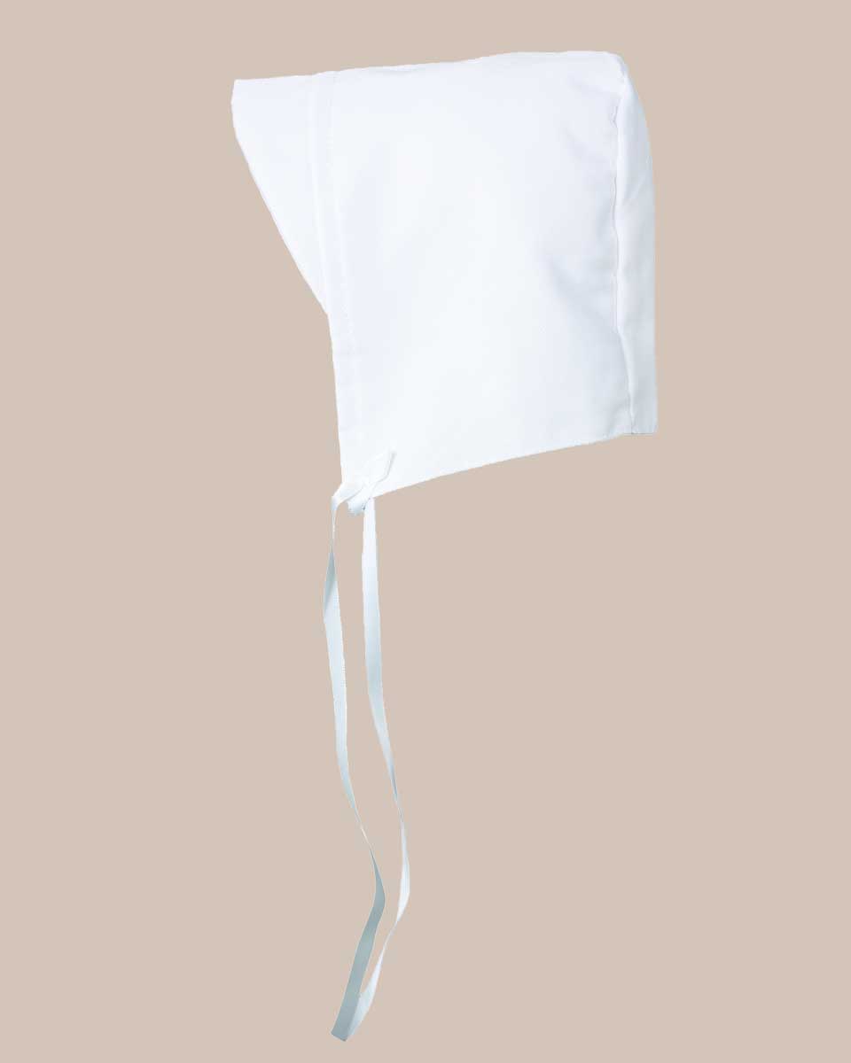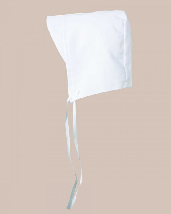 A simple yet handsome baby boys cap/hat featuring a flexible brim, ribbon ties, full lining, and is made from a super soft blend of 65% Polyester 35% Rayon.