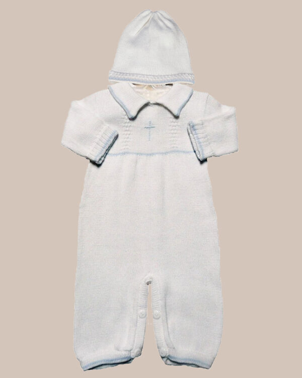100% Soft Cotton Knit collared long sleeve, long pant with blue cross and trim. Ideal for Christening, Baptism, Blessing or any Special Occasion. (BT-A268)