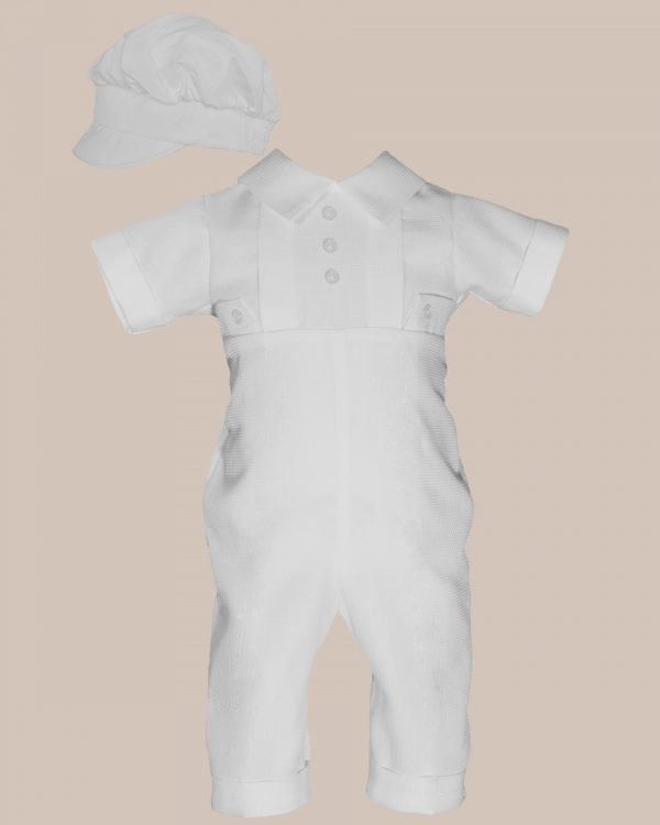 Classic boy’s christening outfit made of elegant waffle pique poly cotton fabric. Includes matching hat. Hand wash. An heirloom preservation bag set is recommended for long-term storage. Available in 3, 6 & 12 month. (WP11CS) (WP11CS03) (WP11CS06) (WP11CS12)