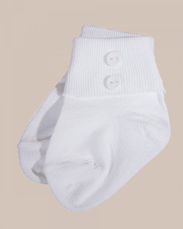 White baby boys 100% cotton fine gauge anklet sock trimmed with two buttons.