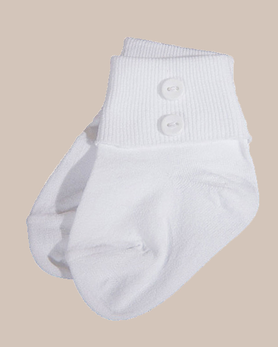 White baby boys 100% cotton fine gauge anklet sock trimmed with two buttons. Perfect for Christening or any other Special Occasion. NB 0-3 Month (Shoe Size 0-2), SM 6-12 Month (Shoe Size 2-4), MD 18-24 Month (Shoe Size 4-6). (WBSOCK)