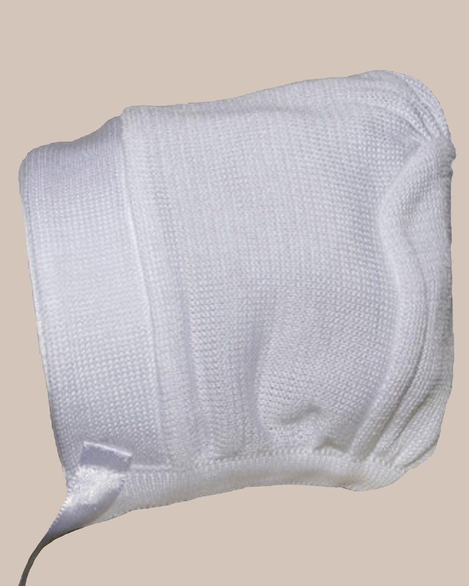 Boys white cotton knit hat or bonnet. Long ribbon ties with ribbon detailing sewn into brim. 1 inch brim for a defining look. Elastic neckline for a better fit. High quality fabric. Durable and super soft 100% combed cotton. Perfect for a christening or any other special occasion. (CKNITH)