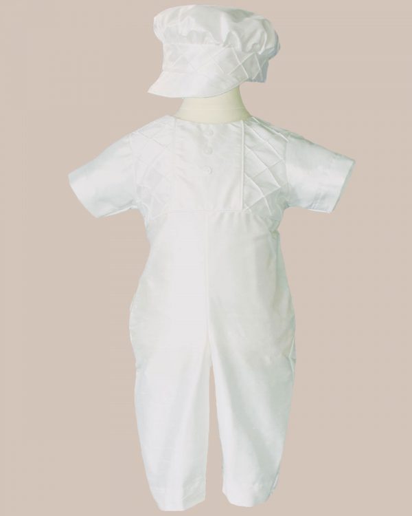 Elegantly masculine silk dupioni boys heirloom christening outfit with pin tucked lattice & buttons.