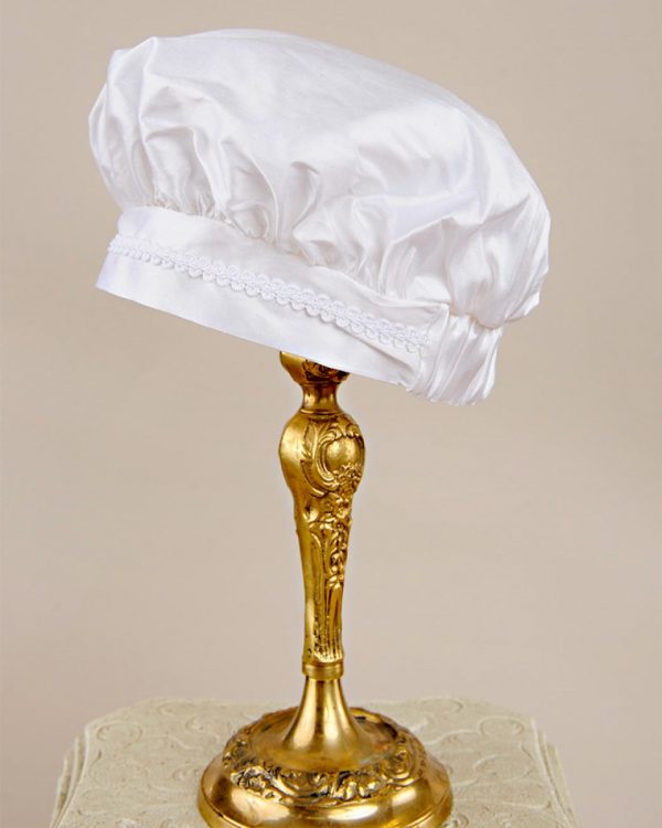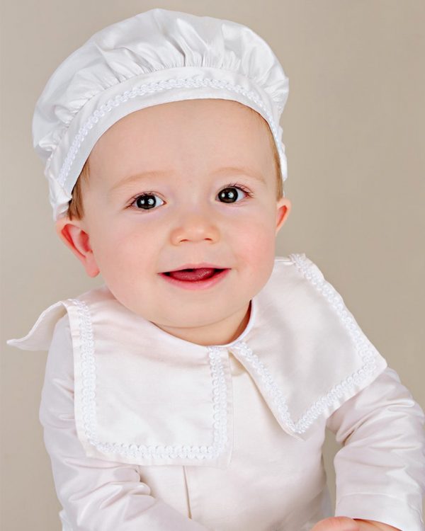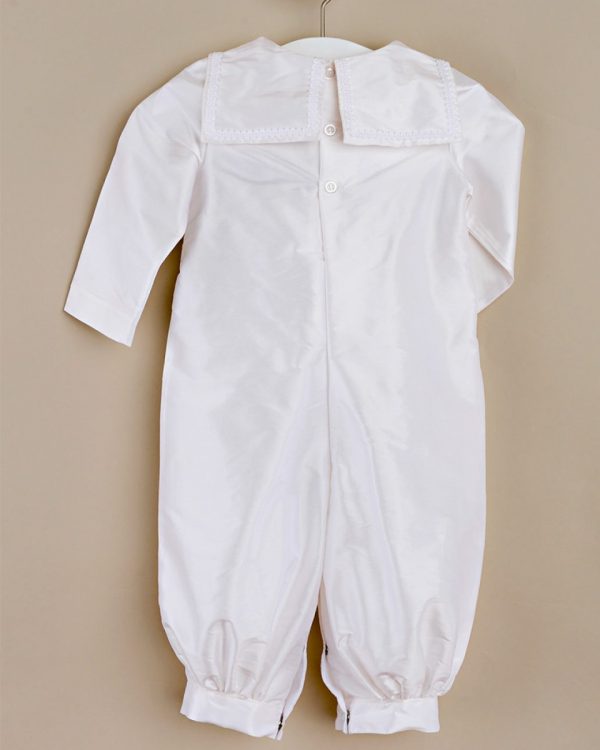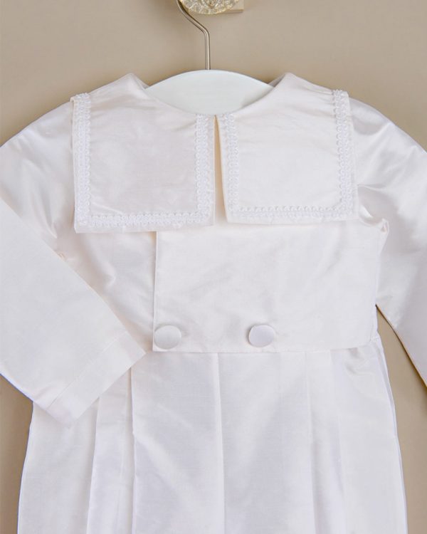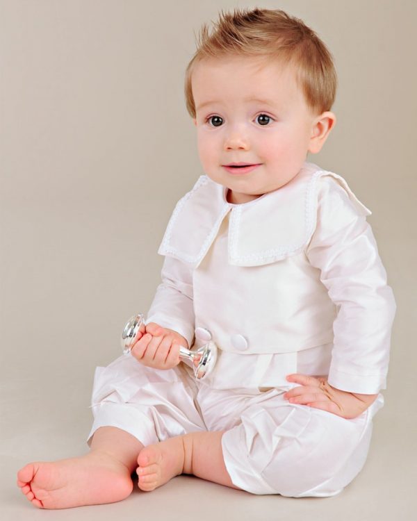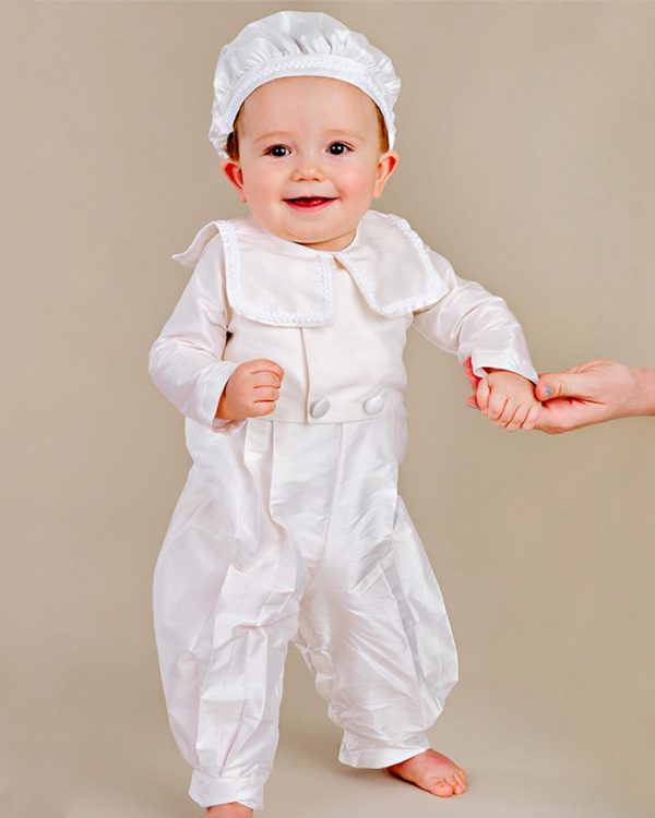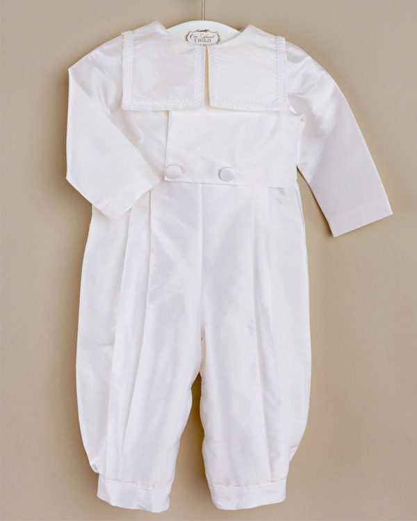 A taste of old-world elegance in a practical one-piece silk christening outfit, featuring an attached double-breasted jacket and sweet sailor collar.
