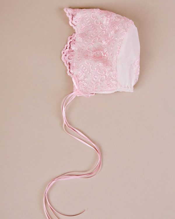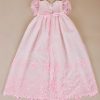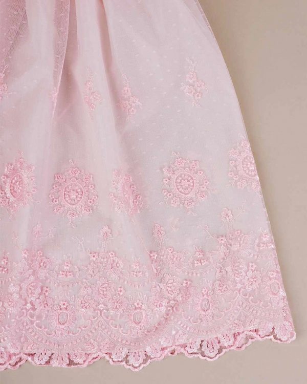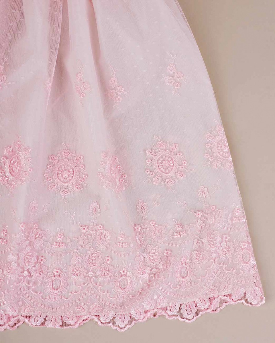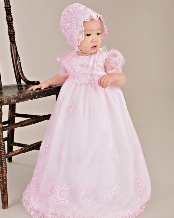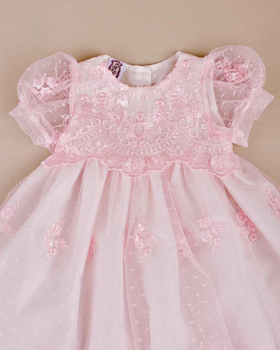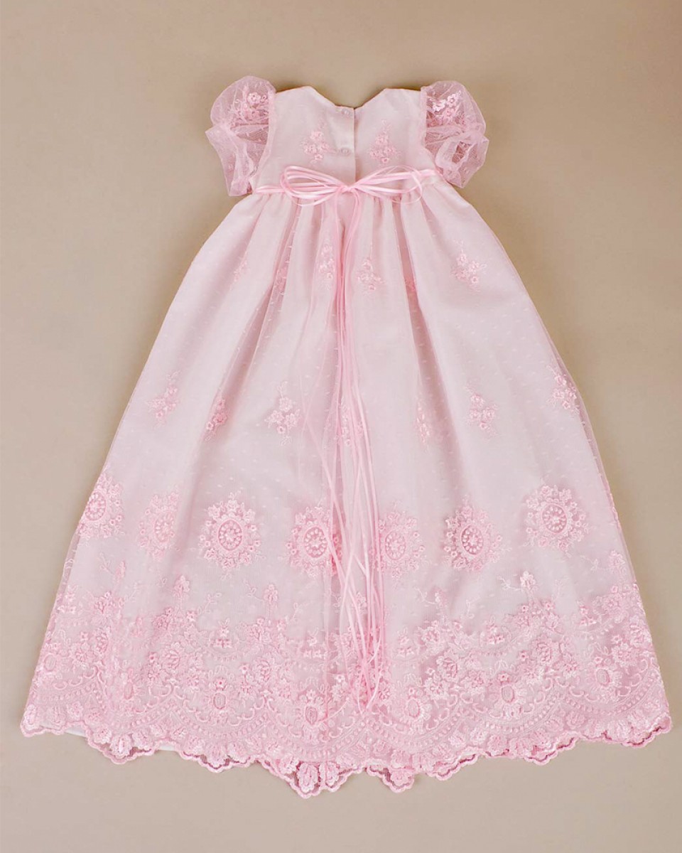 Dare to be different! This magnificent gown is made of soft pink embroidered French netting with a soft ivory lining.