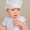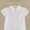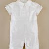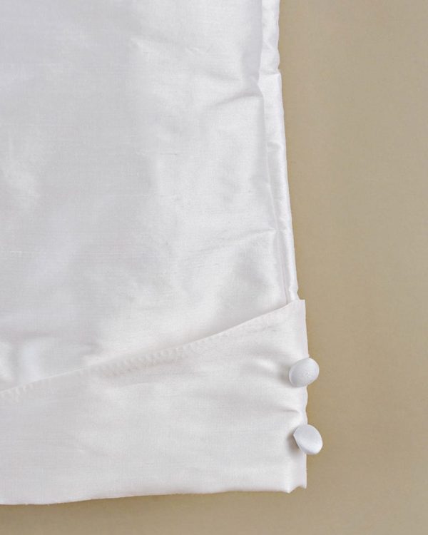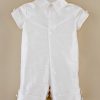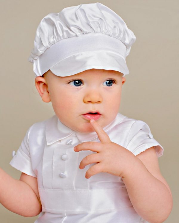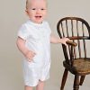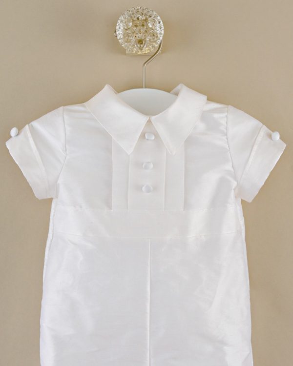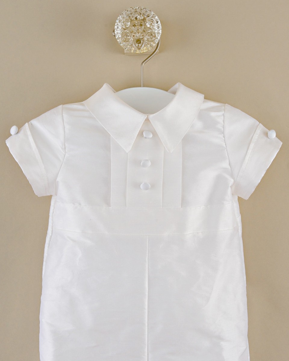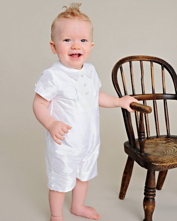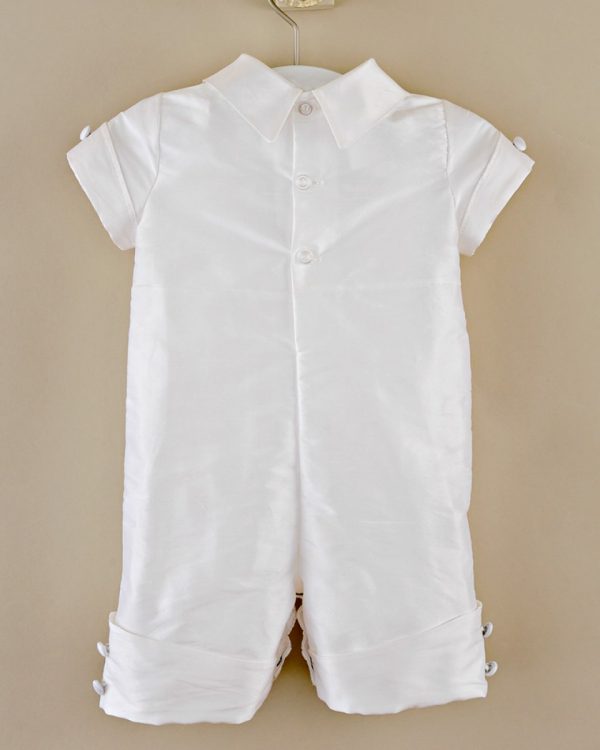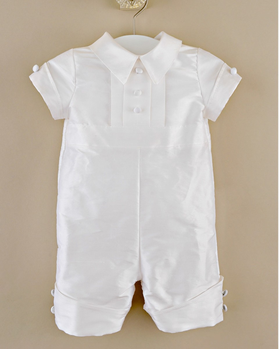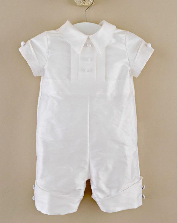 A dignified romper made from luxurious dupioni silk. This heirloom outfit features stately cuffs, pleats and covered button details. Perfect for your little gentleman’s Summer event!