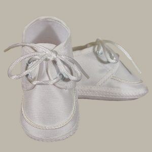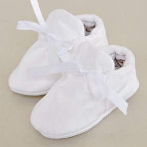 Debonair christening bib with satin bow tie. Accented with pin tucking and buttons. Poly cotton gabardine backed with cotton flannel. Hand Wash. Approximate size: 7.5″ x 9″. Packaged in vinyl bag. (PC97XB)