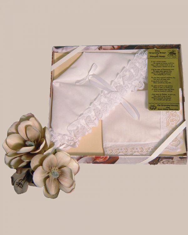 Christening Bonnet to Trousseau Hankie Gift Set with 1″ lace.
