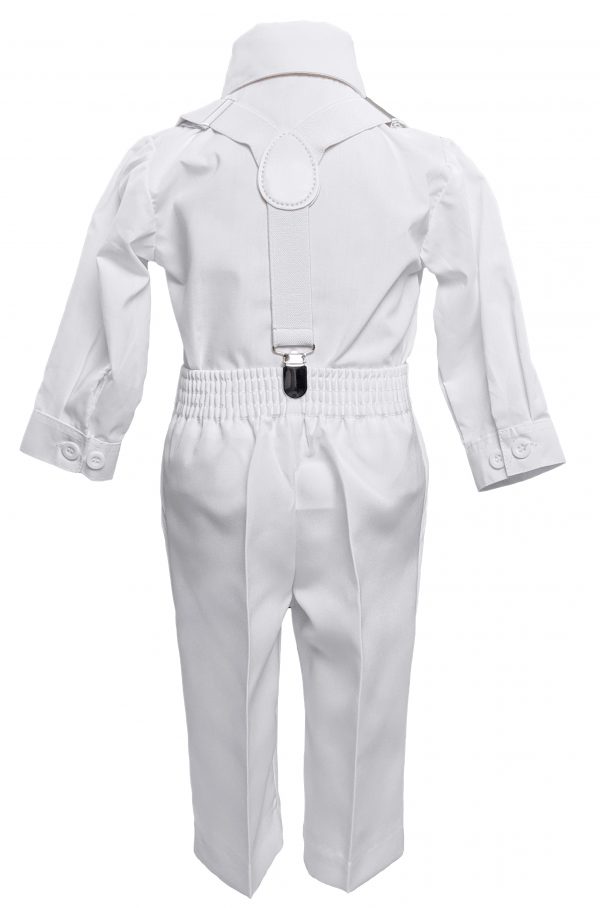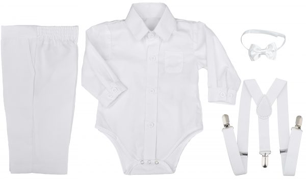 4-piece set includes bodyshirt, pants, suspenders, and bow tie