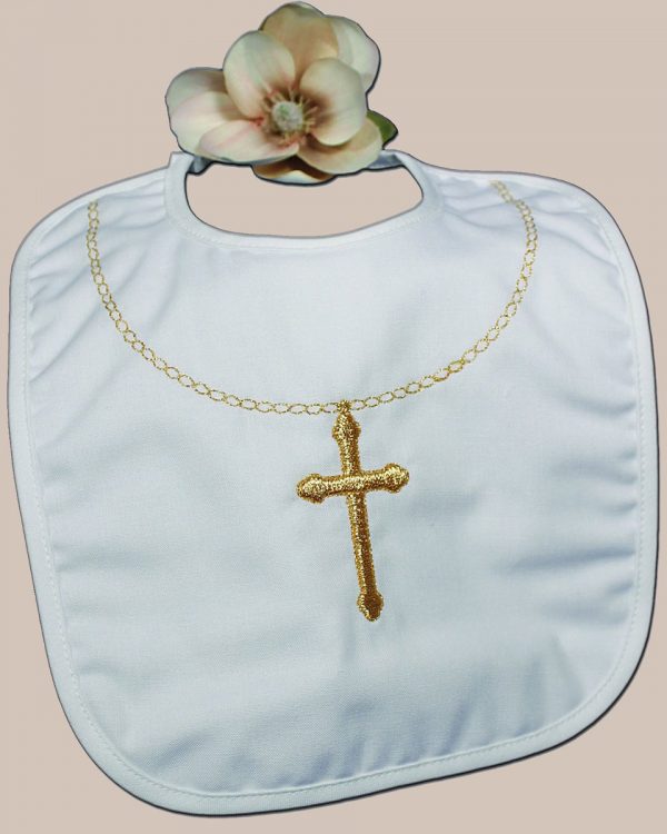 Cute 100% cotton special occasion baby bib. Features fancy embroidered gold chain and cross. Approximate sizes: Small = 7″ x 7″ | Large = 7.5″ x 9″.