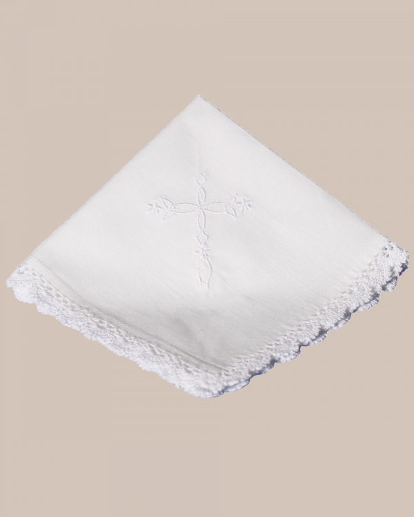 Beautiful cotton heirloom christening gift handkerchief. This eloquent hanki features a simple embroidered ornate cross and crochet style lace edging. Made from soft, thin, and durable 100% Cotton making this ideal to fit into any suit or pants pocket.