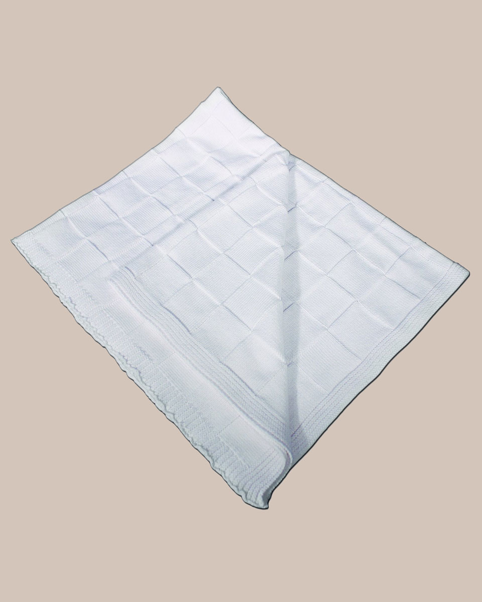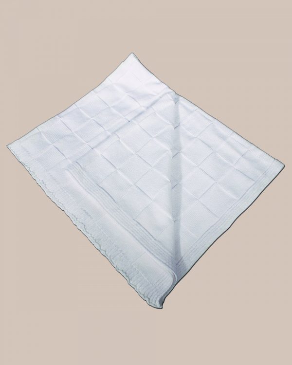 High quality 100% soft cotton knit white shawl. Features a beautiful checkerboard style pattern. Use as a receiving blanket or crib blanket. Can be taken on car trips or used in a stroller. Its stylish design makes this keepsake/heirloom a great baby shower gift idea. Perfect for Christening, Baptism or any other special occasion. Approximate size: 32″ x 39″. (CKCSHAWL)