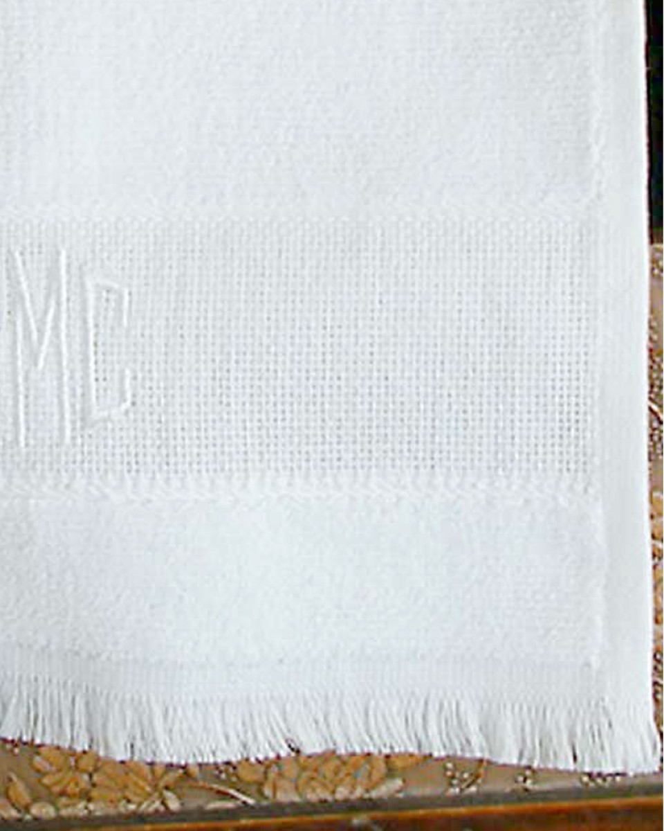 A plush cotton terry fingertip towel featuring a band of aida-cloth for embroidered personalization.