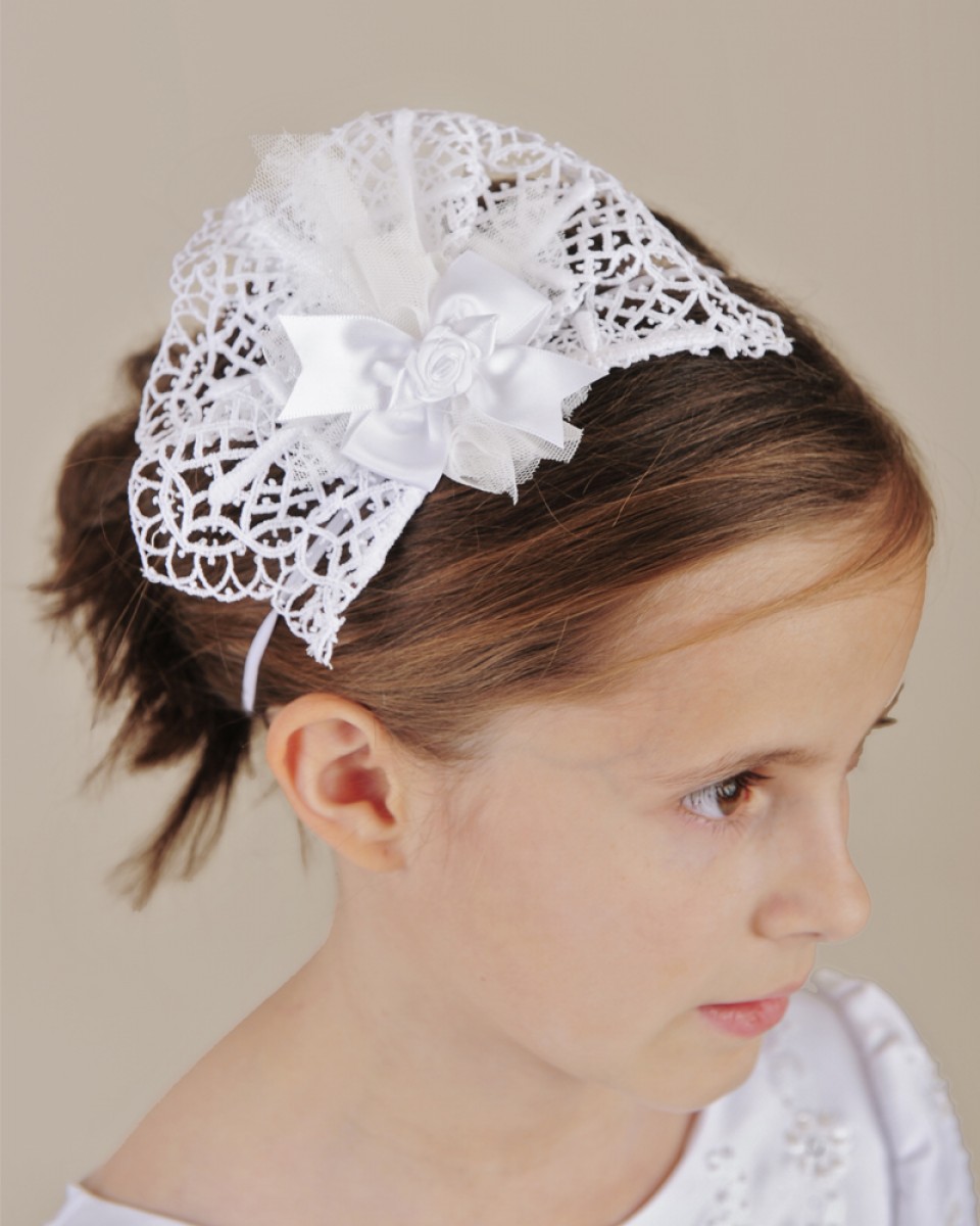Graceful cross-patterned venise lace is accented with lush tulle and topped with a pretty satin bow on this sweet vintage-inspired headband.