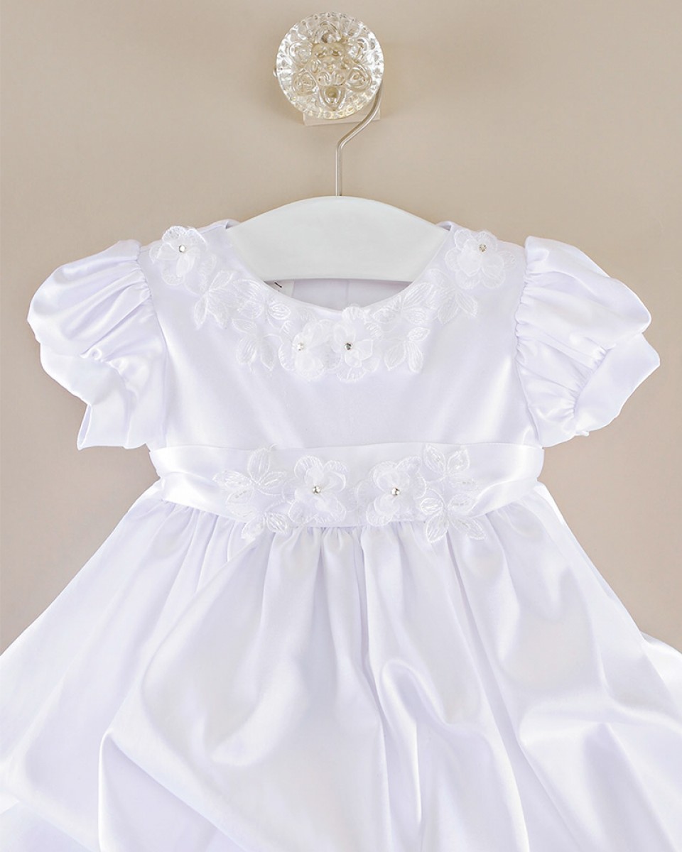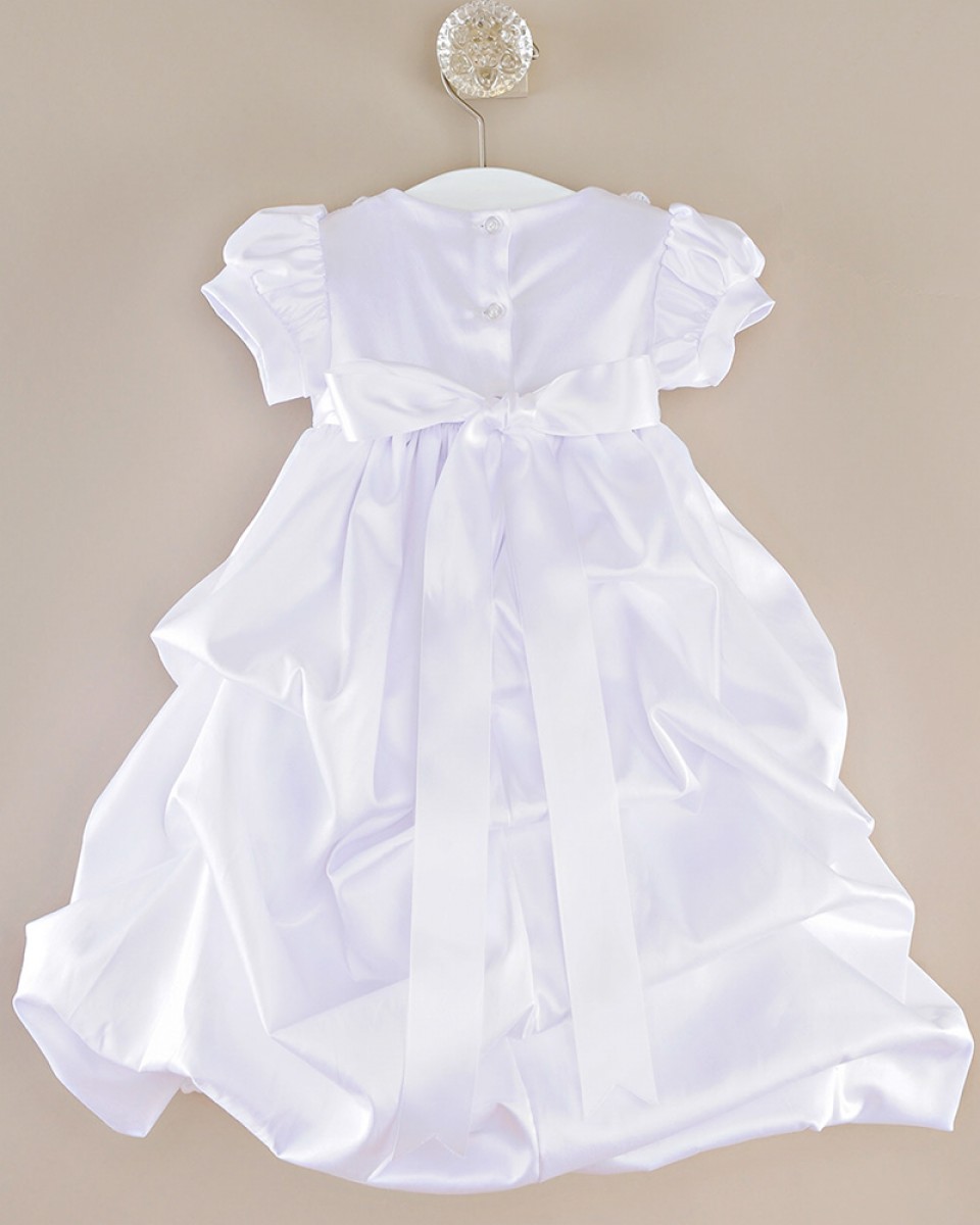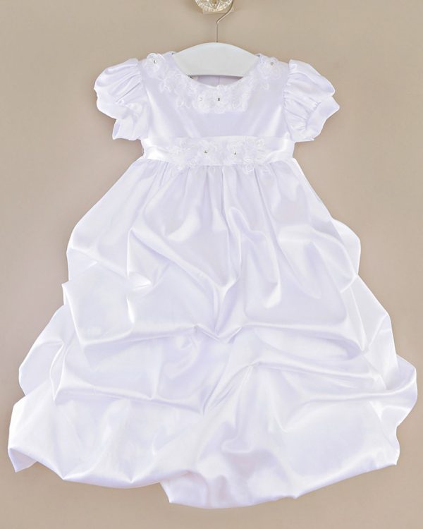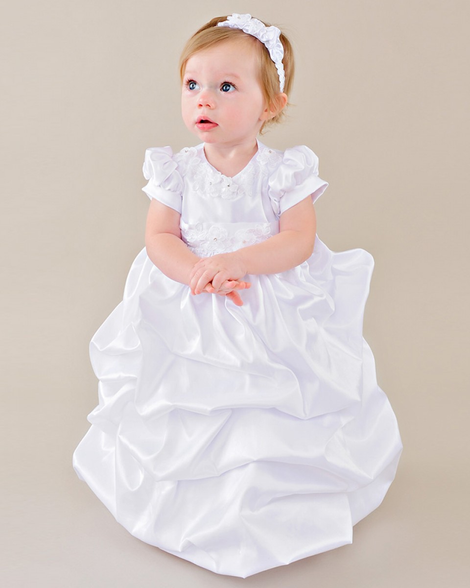 She’ll be the leading lady in this darling gown featuring dainty lace details and lavish billows of satin cascading down the skirt.