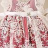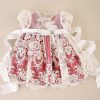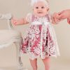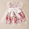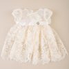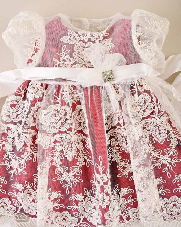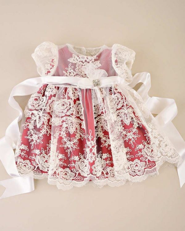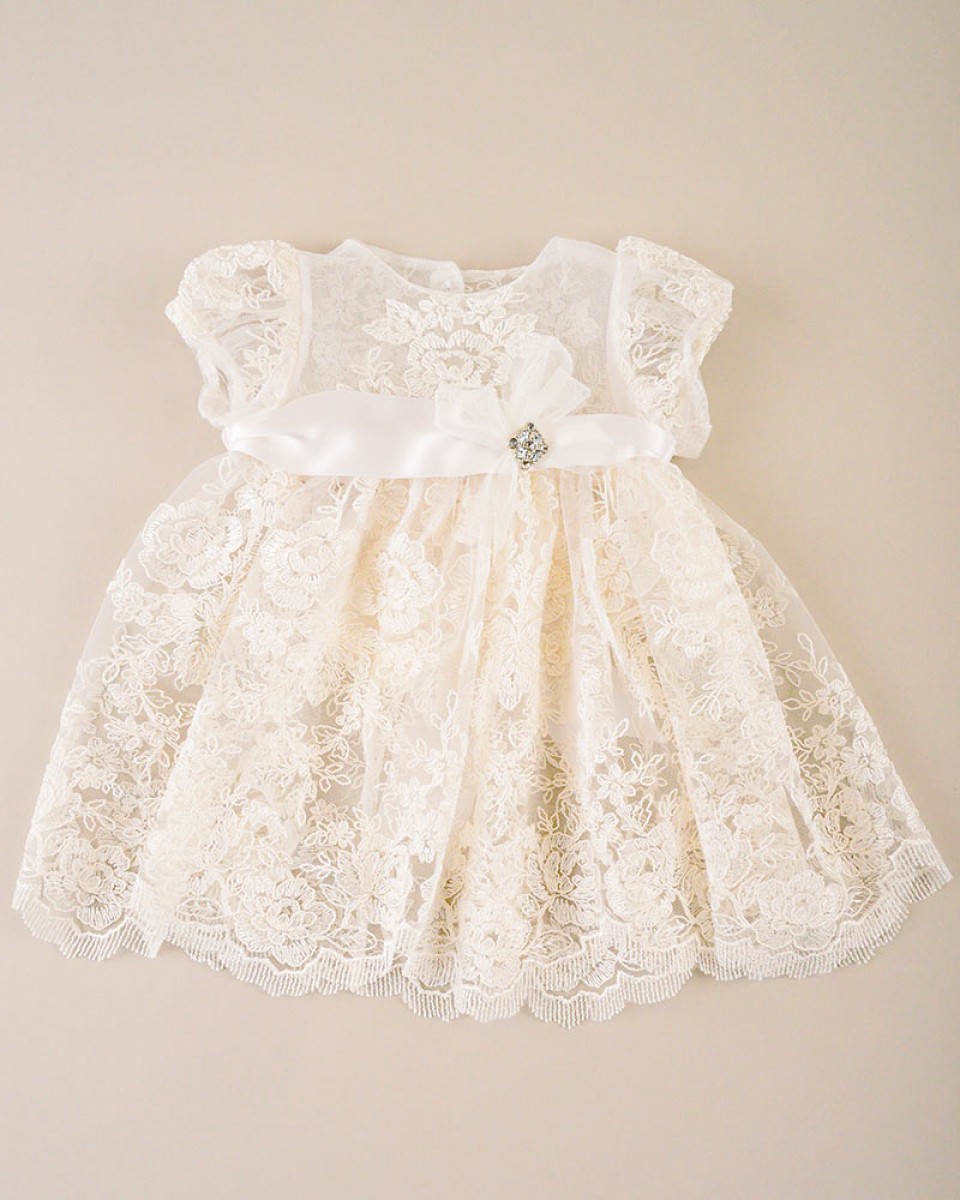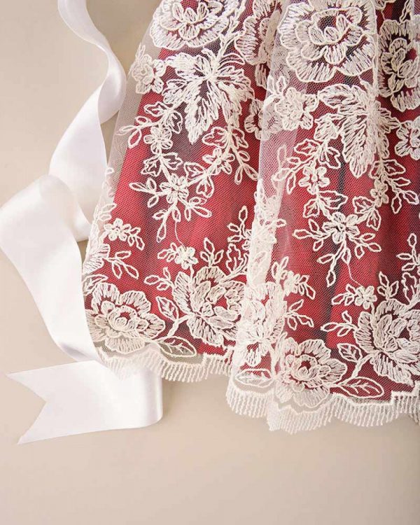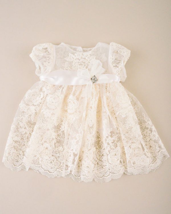 Embroidered lace over-gown features puffed sleeves, finished with gorgeous silk ribbon sash
