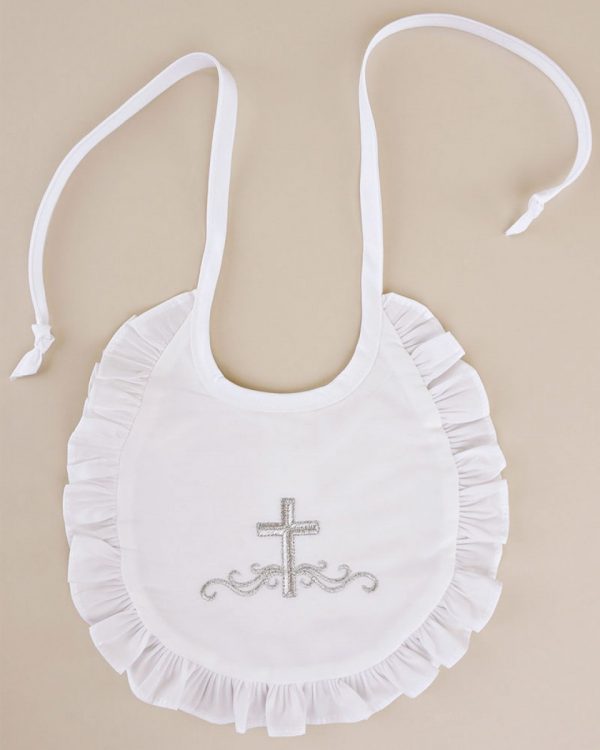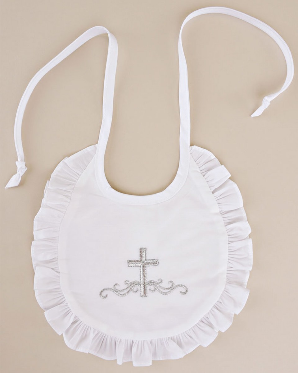 Embroidered with a beautiful cross, this luxuriously ruffled bib is a lovely way to remember baby’s special day forever. Your choice of fabrics.
