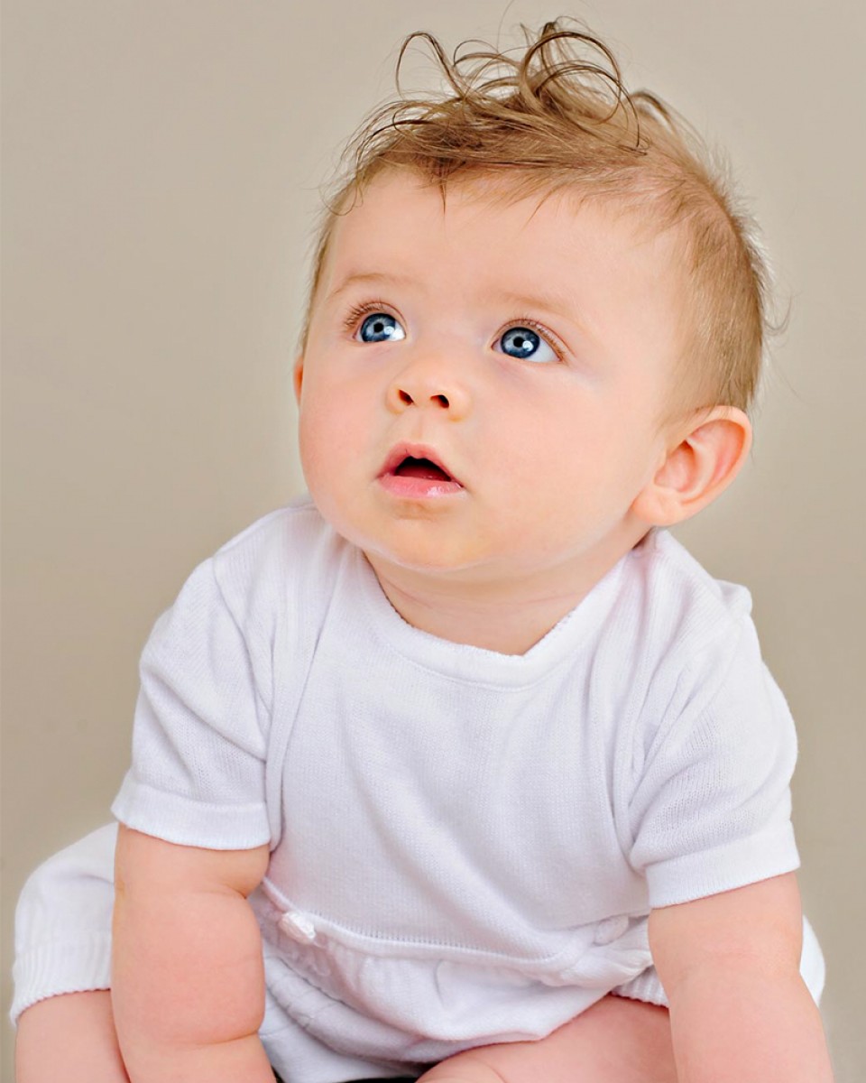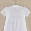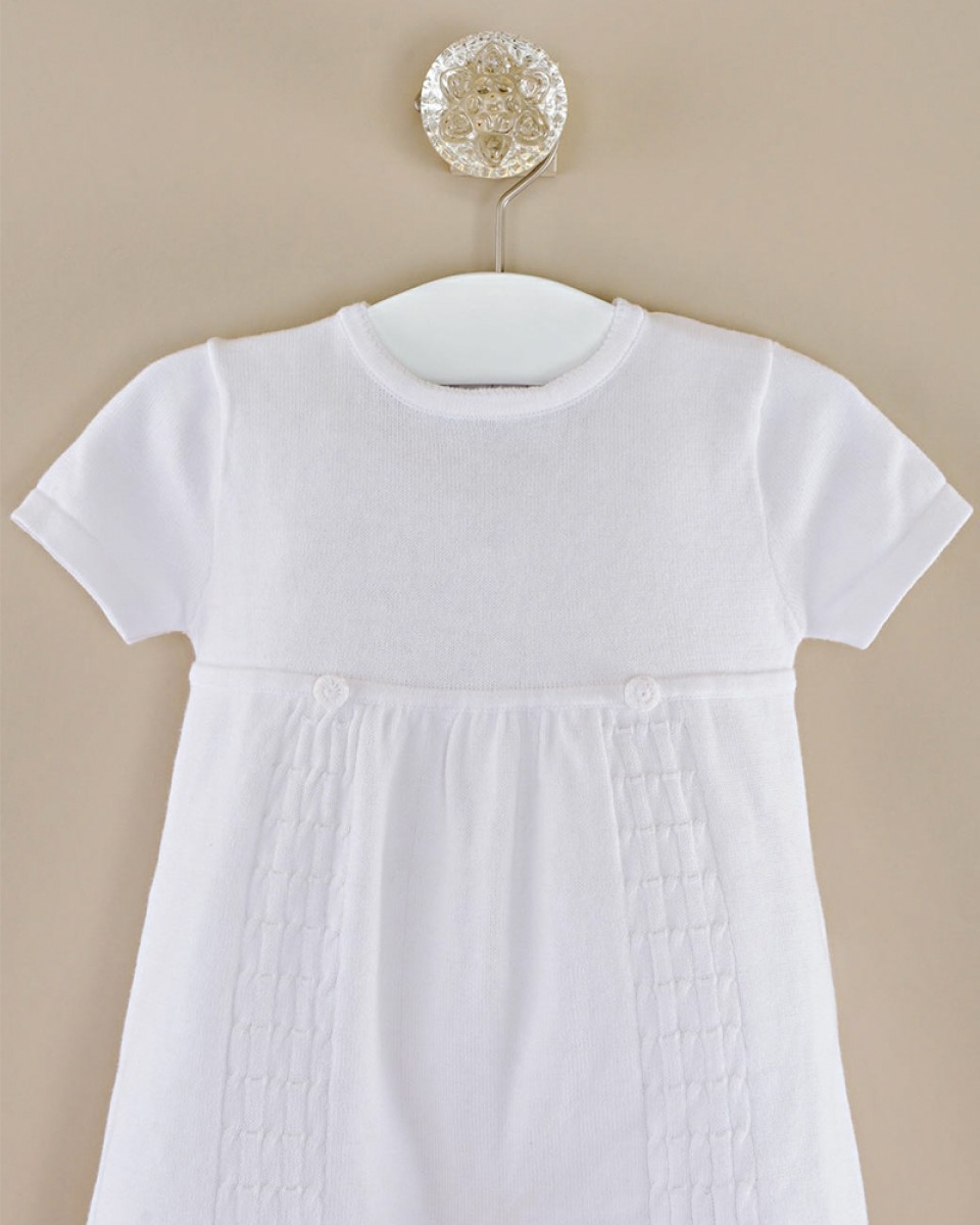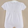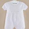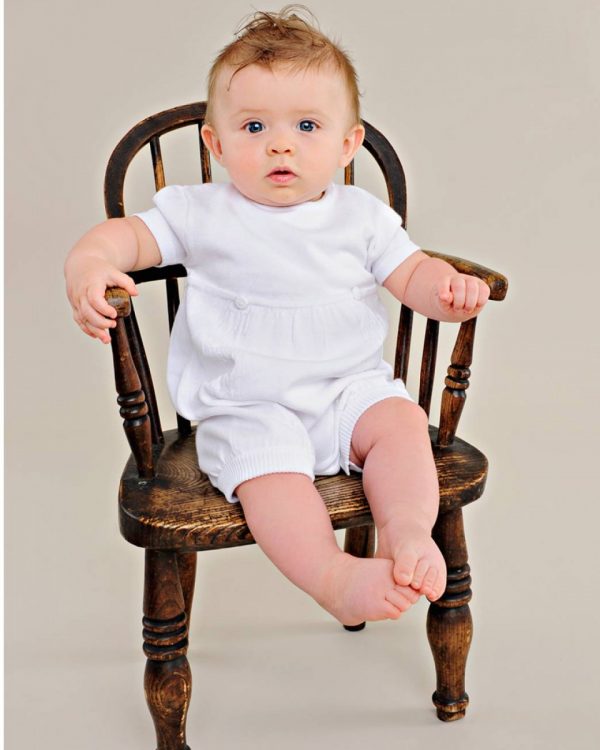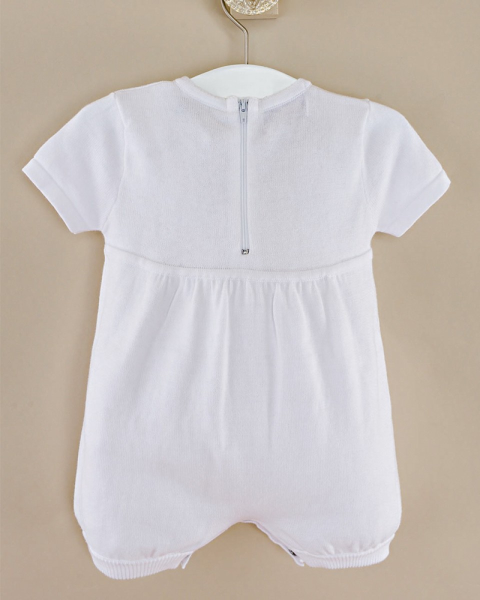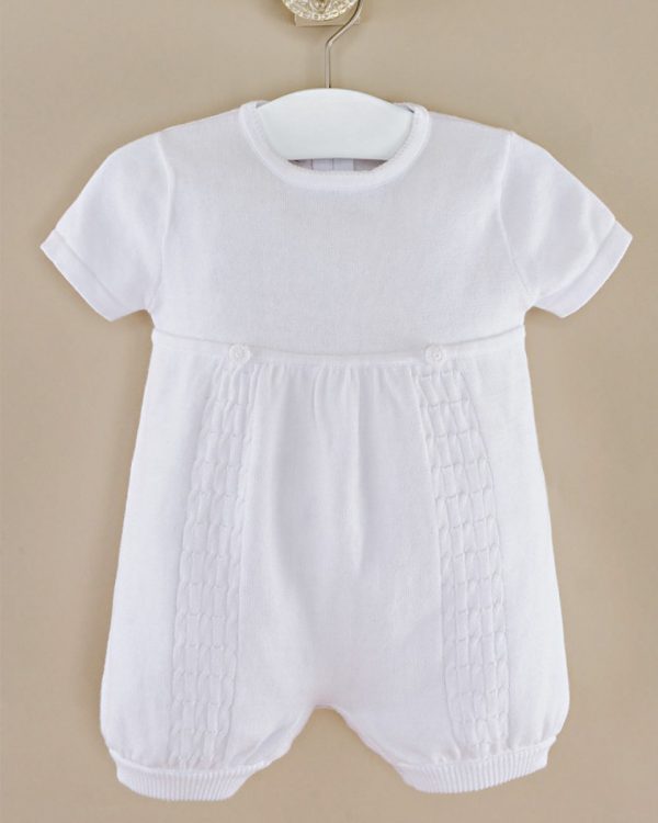 A dapper summer-weight cotton knit romper featuring unique covered buttons and simple cable-knit detailing.
