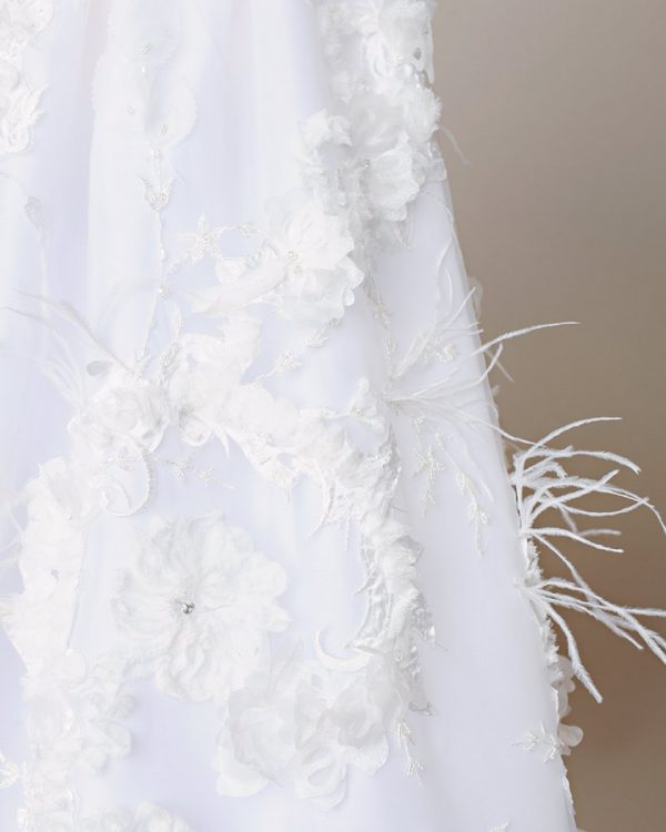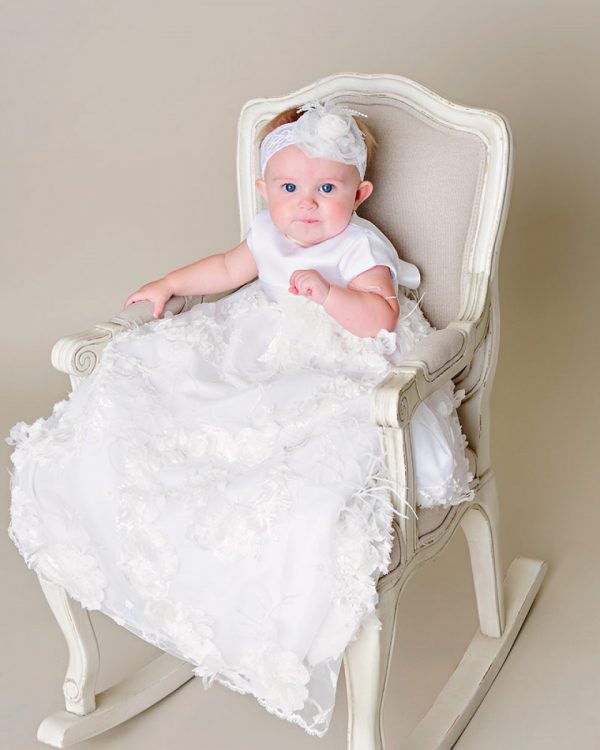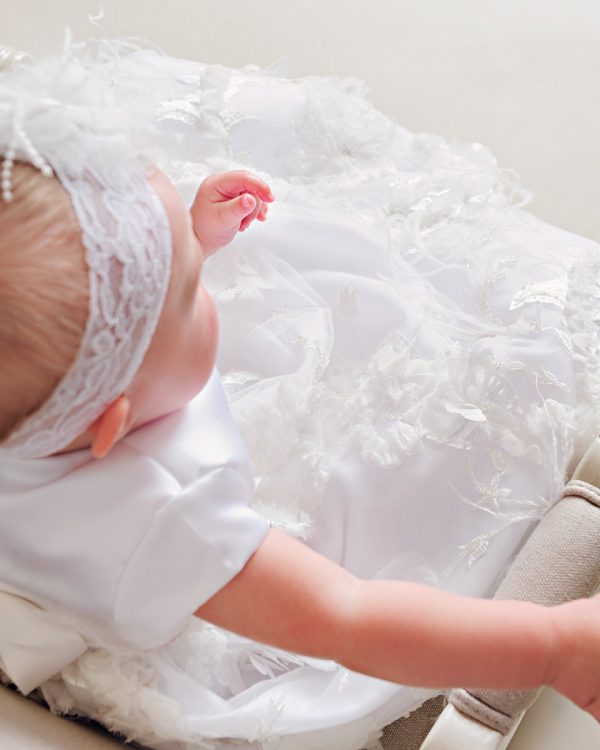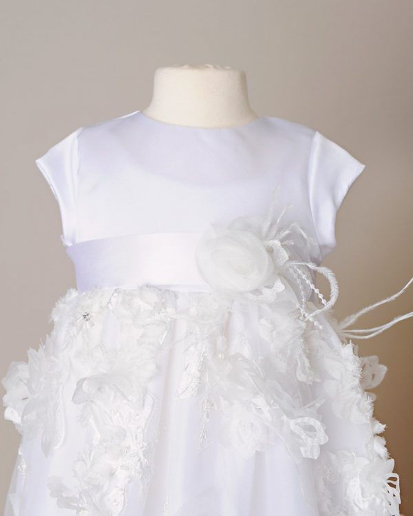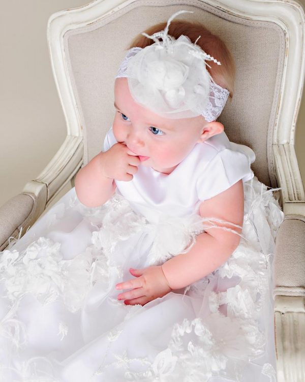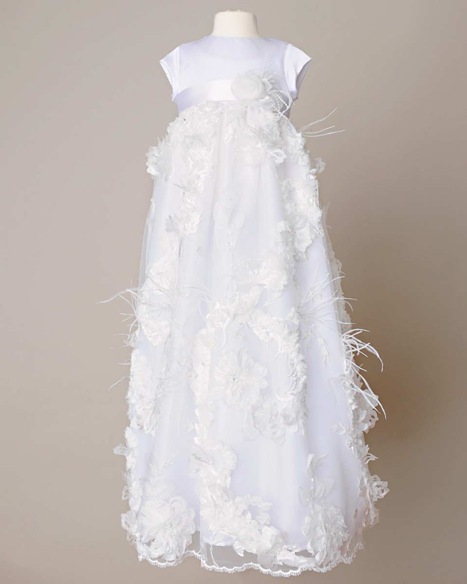 Our Fancy Christening Gown lives up to her name with eccentric feather accents on an exaggerated organza skirt. This gown is absolutely stunning!