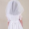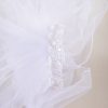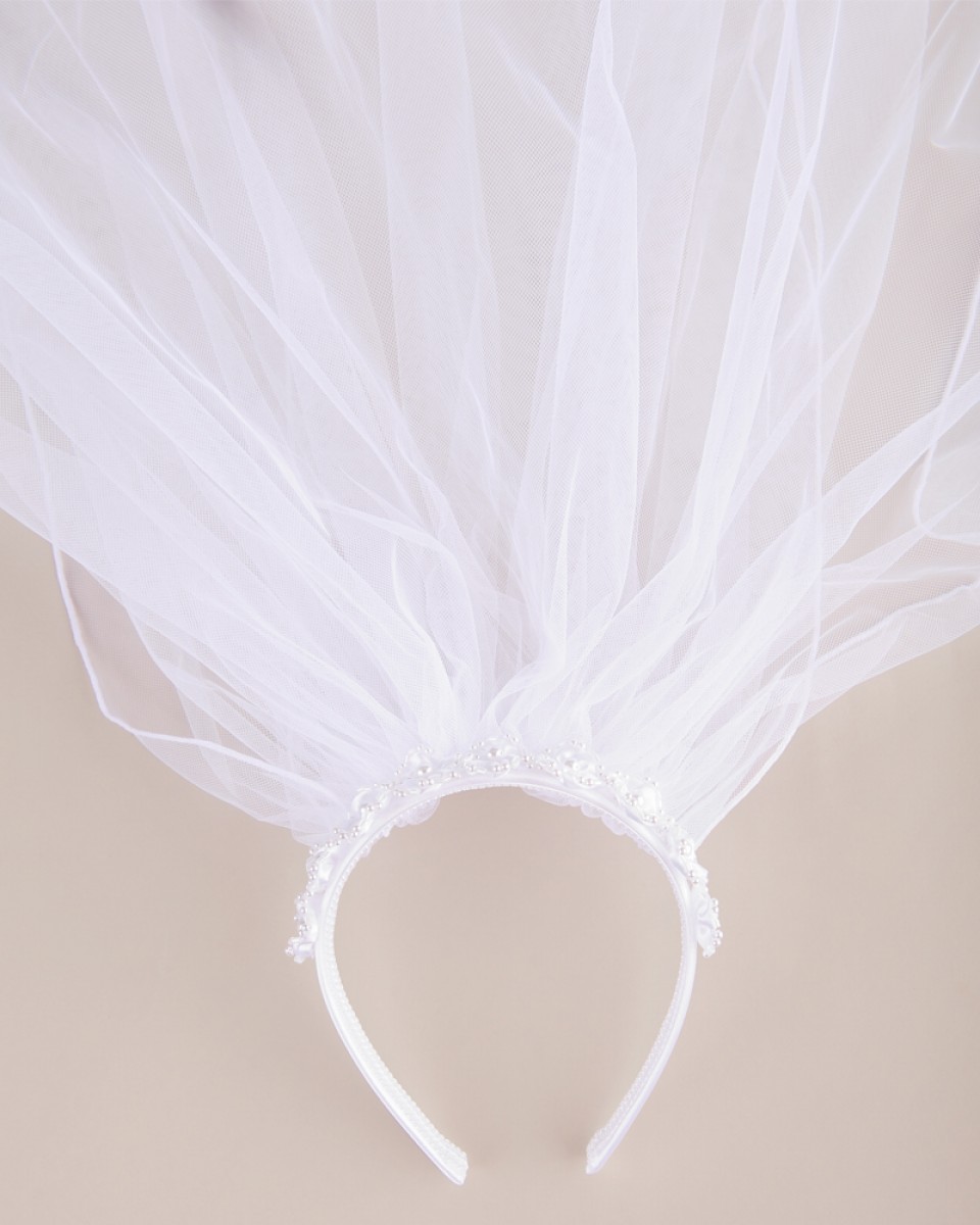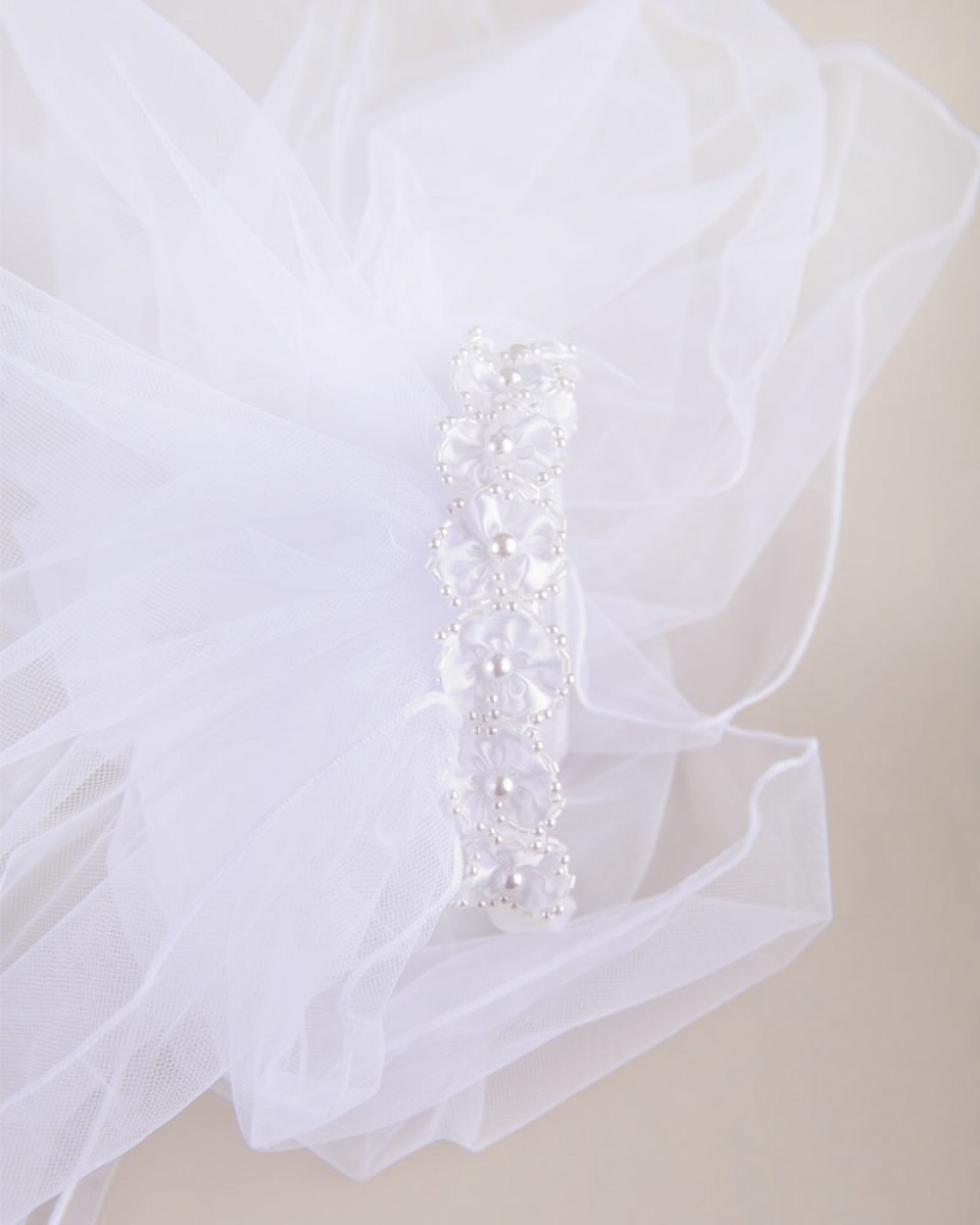 This sweet headband veil features dainty satin flowers and soft tufts of tulle to crown her on that special day!