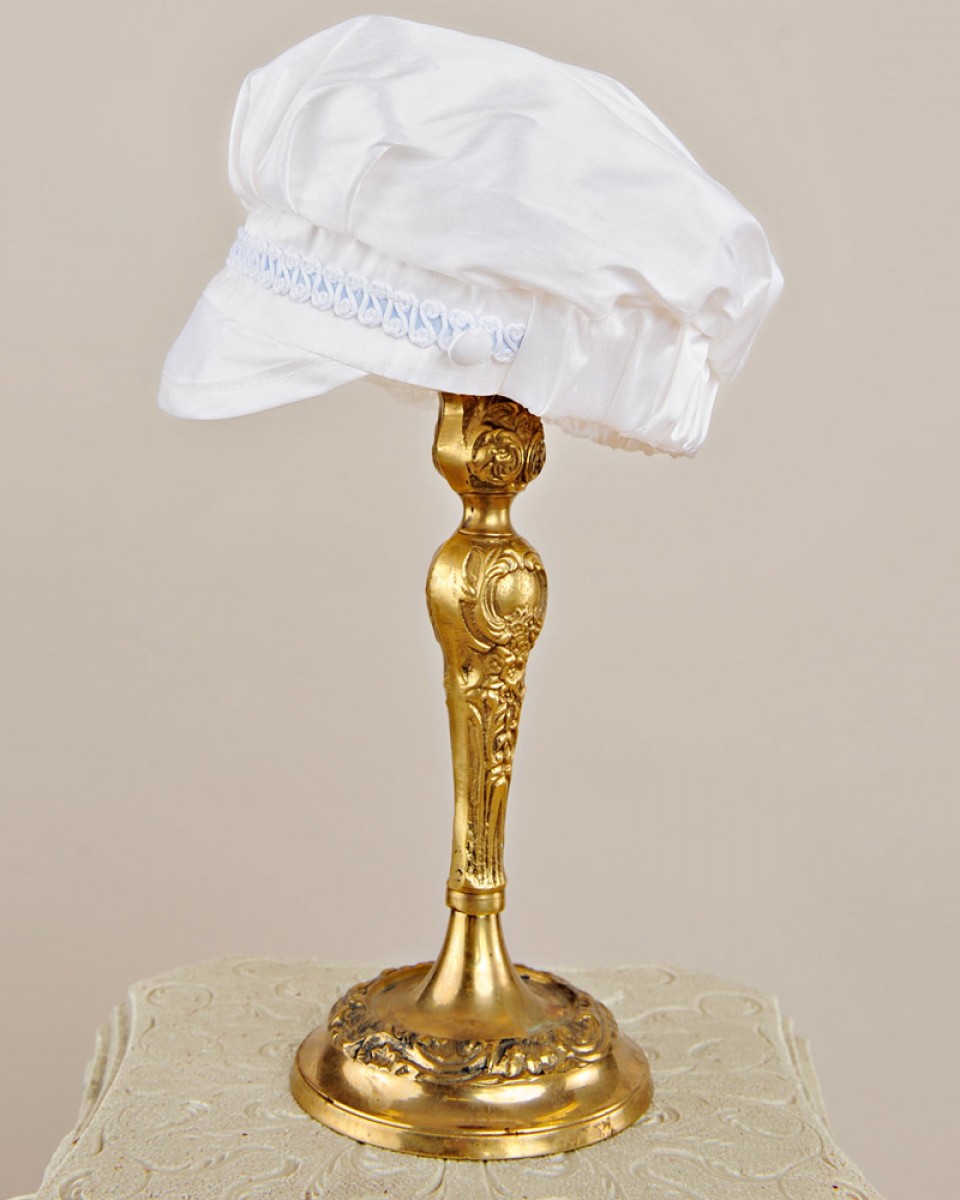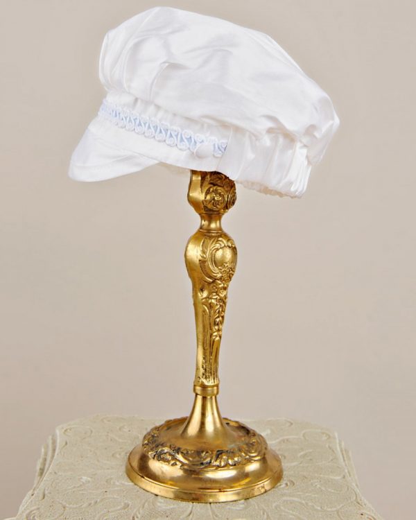 Simple, elegant styling features braid trim underlaid with blue silk ribbon