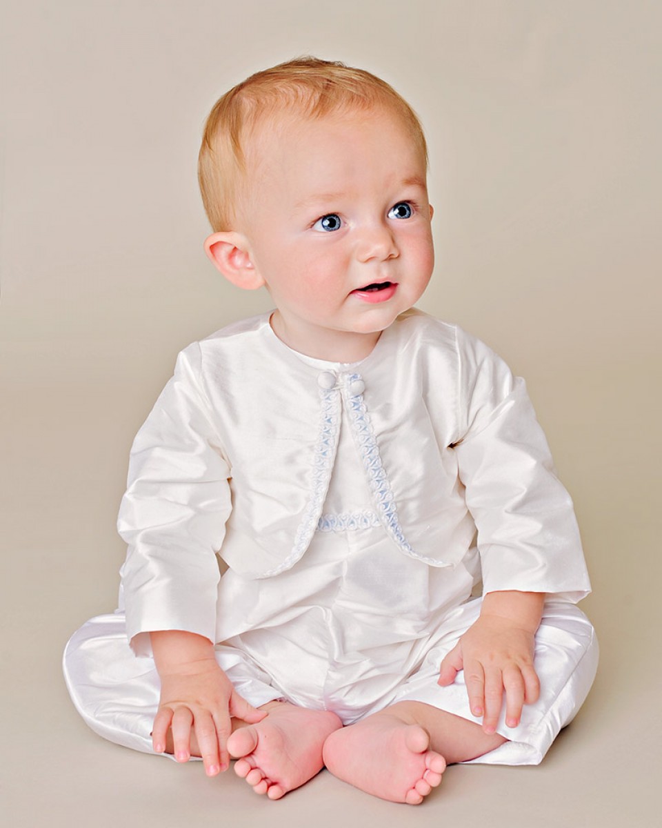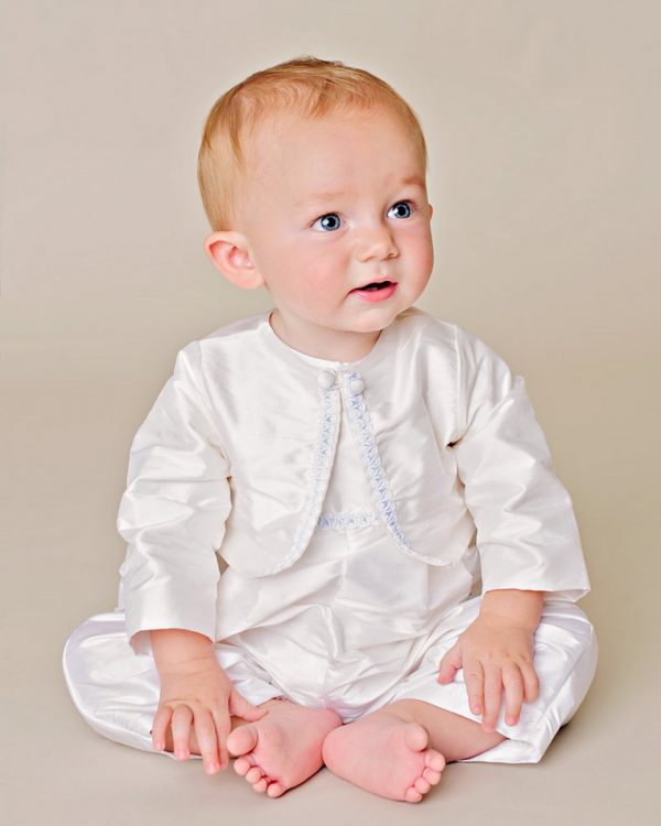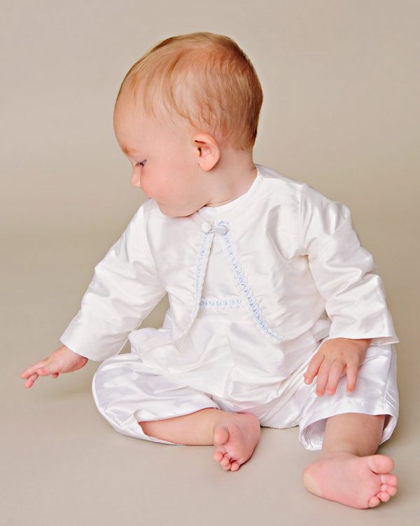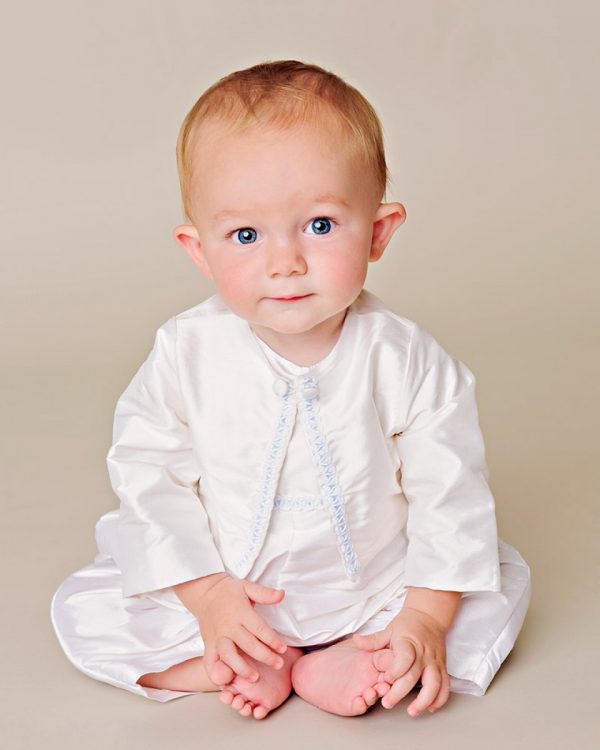 Simple, elegant styling features braid trim underlaid with blue silk ribbon