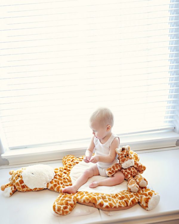 A soft and fun giraffe mat with a cute plush giraffe for baby to love and cuddle! Use for tummy time or nap time!