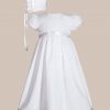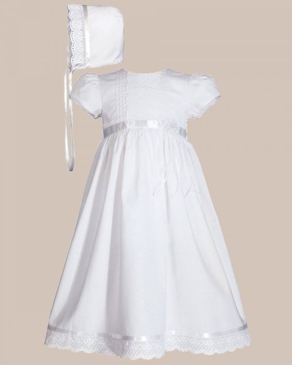 Beautiful girls 100% cotton broadcloth handmade gown with pin tucking, lace, and ribbon. Features cap sleeves, pin-tucking bodice, ribbon, and lace waistline accented with a flower. The gown measures 24 inches in length; includes a matching bonnet. The Little Things Mean a Lot Heirloom Preservation Bag is recommended for long-term storage. Slip available separately. This elegant gown is perfect for Christening, Baptism, or any special occasion such as weddings, church presentations, dedications, and keepsake photos. Please see our size chart in the images for accurate measurements. (CO58GS)