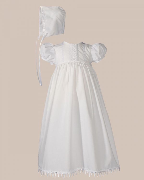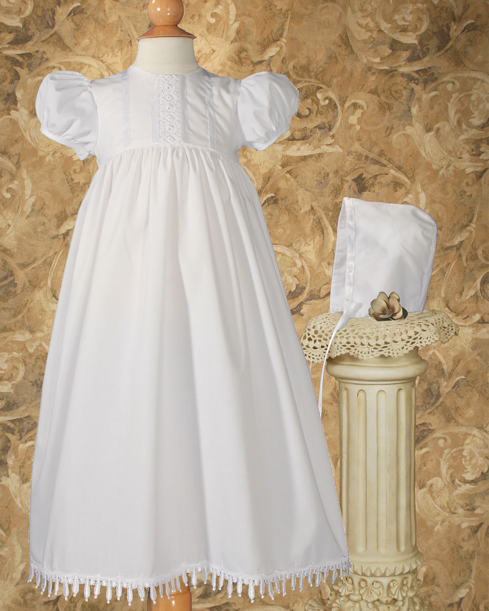 Girls 24″ christening dress with teardrop lace at hem. Includes matching bonnet.