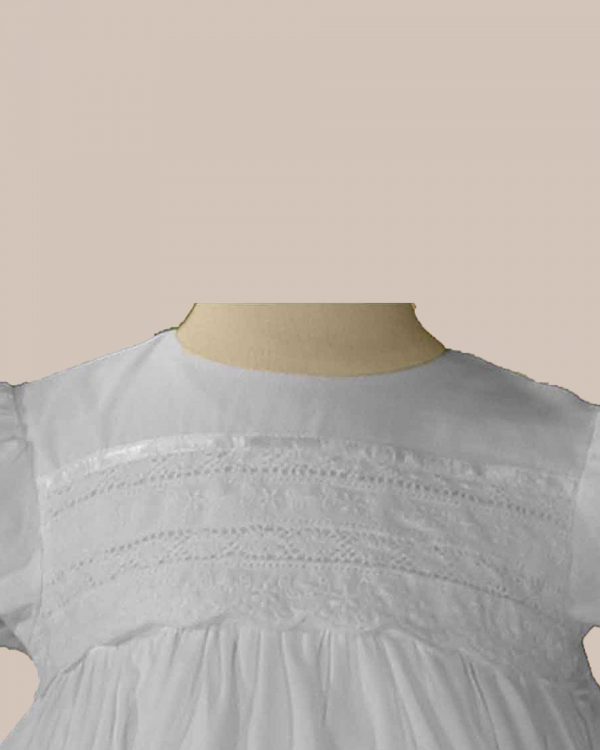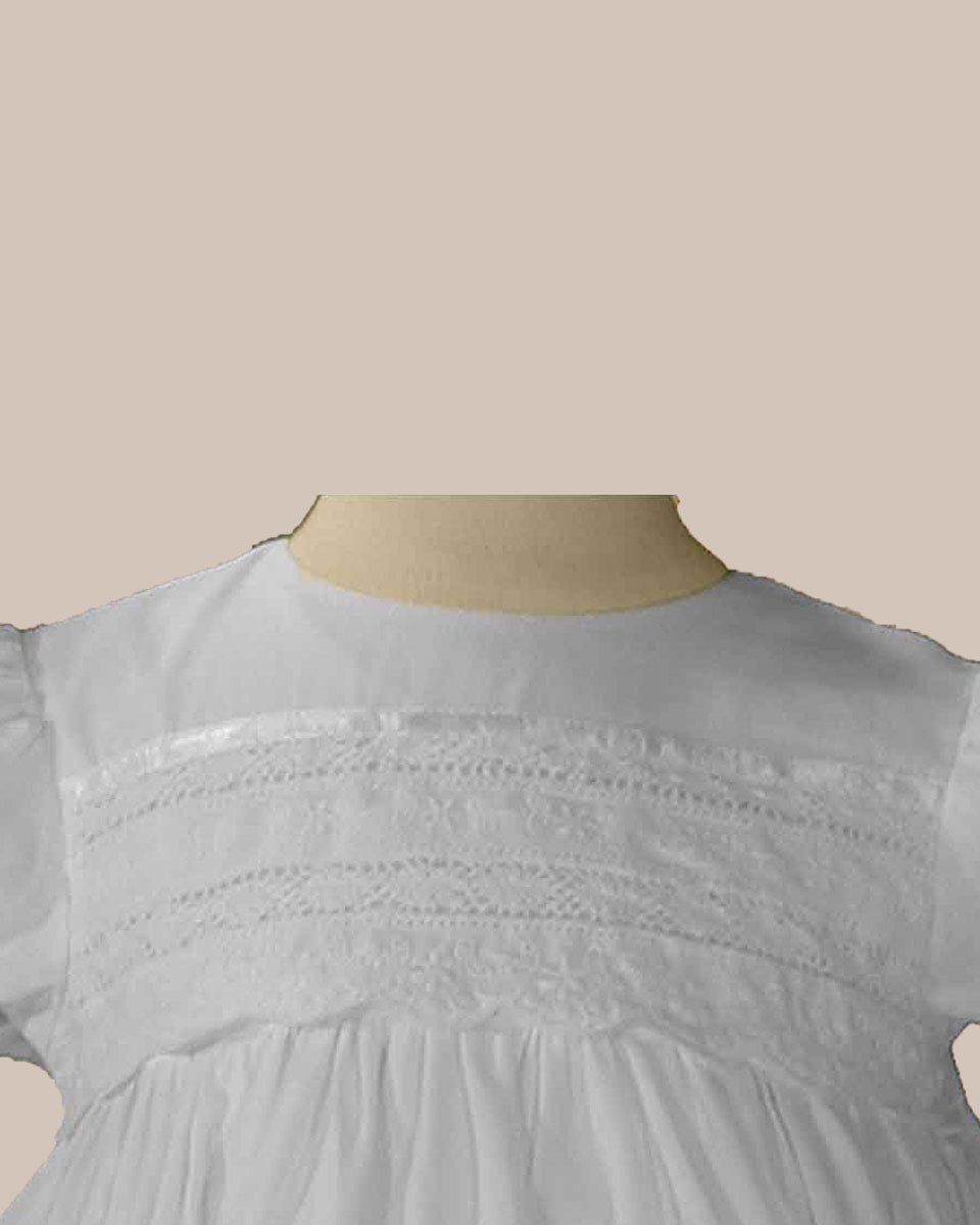 Beautiful girls 100% cotton gown with Venice lace. The gown measures 26 inches in length and includes matching bonnet.