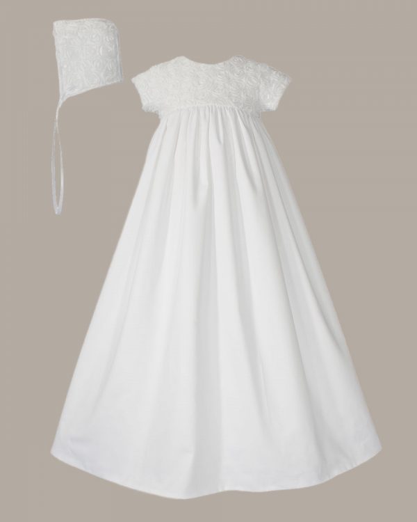 Absolutely stunning 32″ christening gown with rosette netting covered bodice and sleeves. Includes matching bonnet & separate slip. (CS56GS)