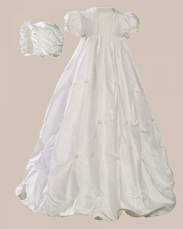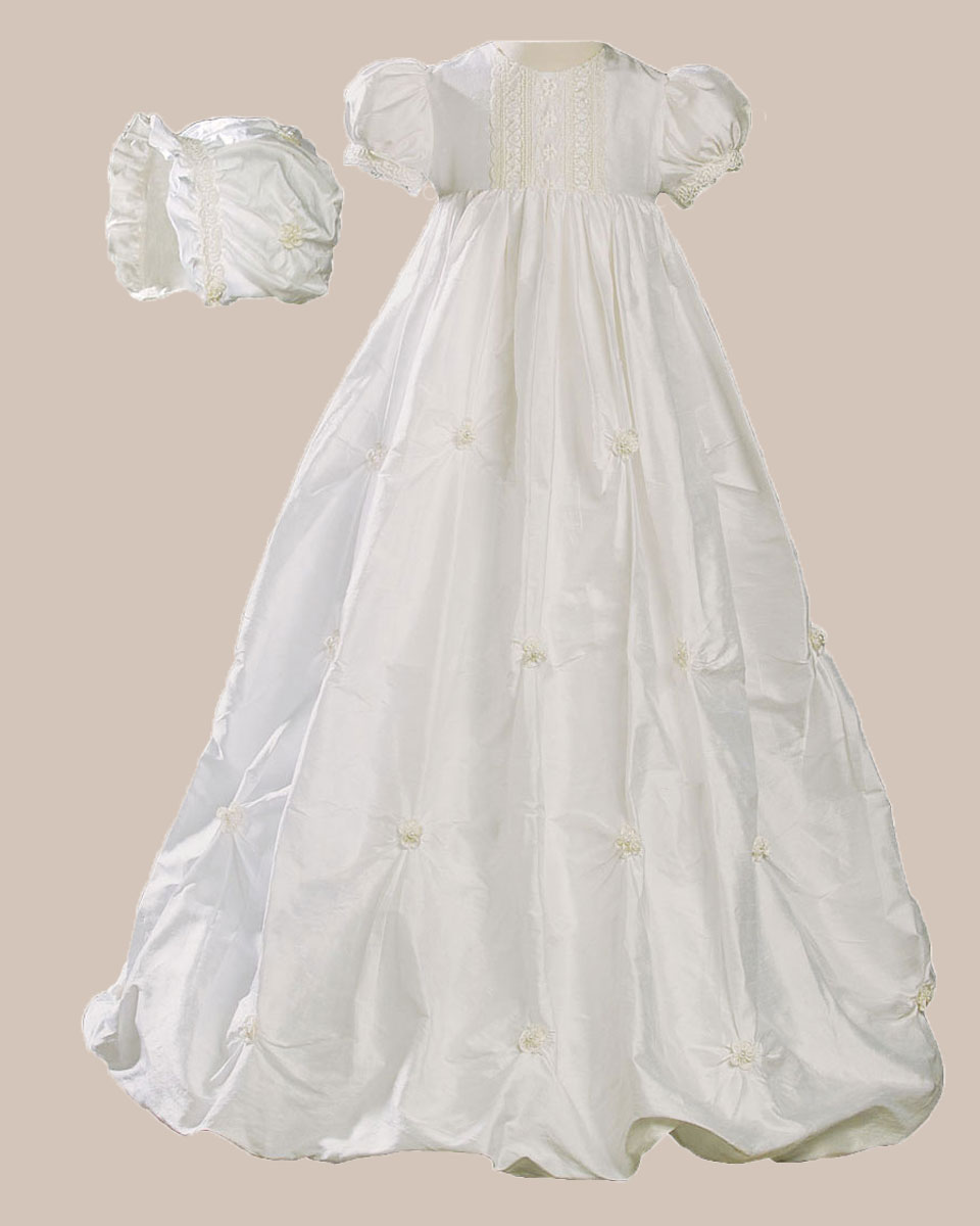 Silk Dupioni heirloom christening gown (slightly off white) with beautiful bubble tucking enhanced by natural rayon pearled flowerettes and natural venise lace. Includes matching hat.