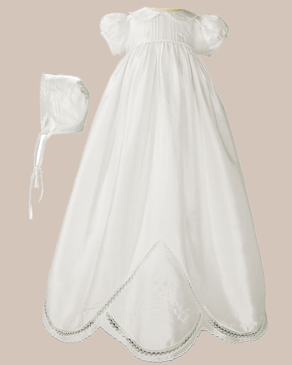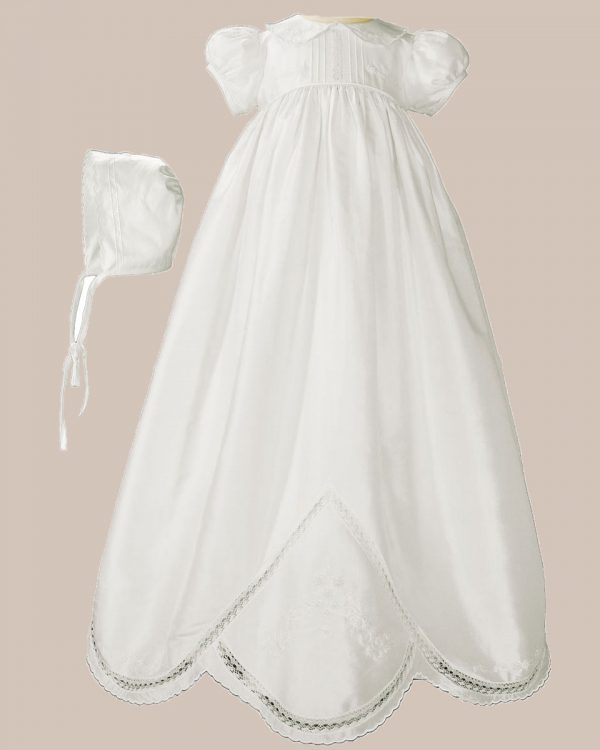 This beautiful all white christening/baptismal gown is perfect for any special occasion such a wedding, church presentation, dedication and keepsake photos. Stunning silk dupioni (slightly off white) 33″ heirloom christening gown with hand embroidery on bodice and skirt. Open work lace gives this gown a traditional elegance. Includes matching bonnet and attached slip. Handmade using 100% Silk. Dry clean. Shipped with elegant padded hanger and zippered vinyl bag. Heirloom Preservation Bag recommended for long term storage. Sizes: 3, 6, and 12 month. (DP12GS)