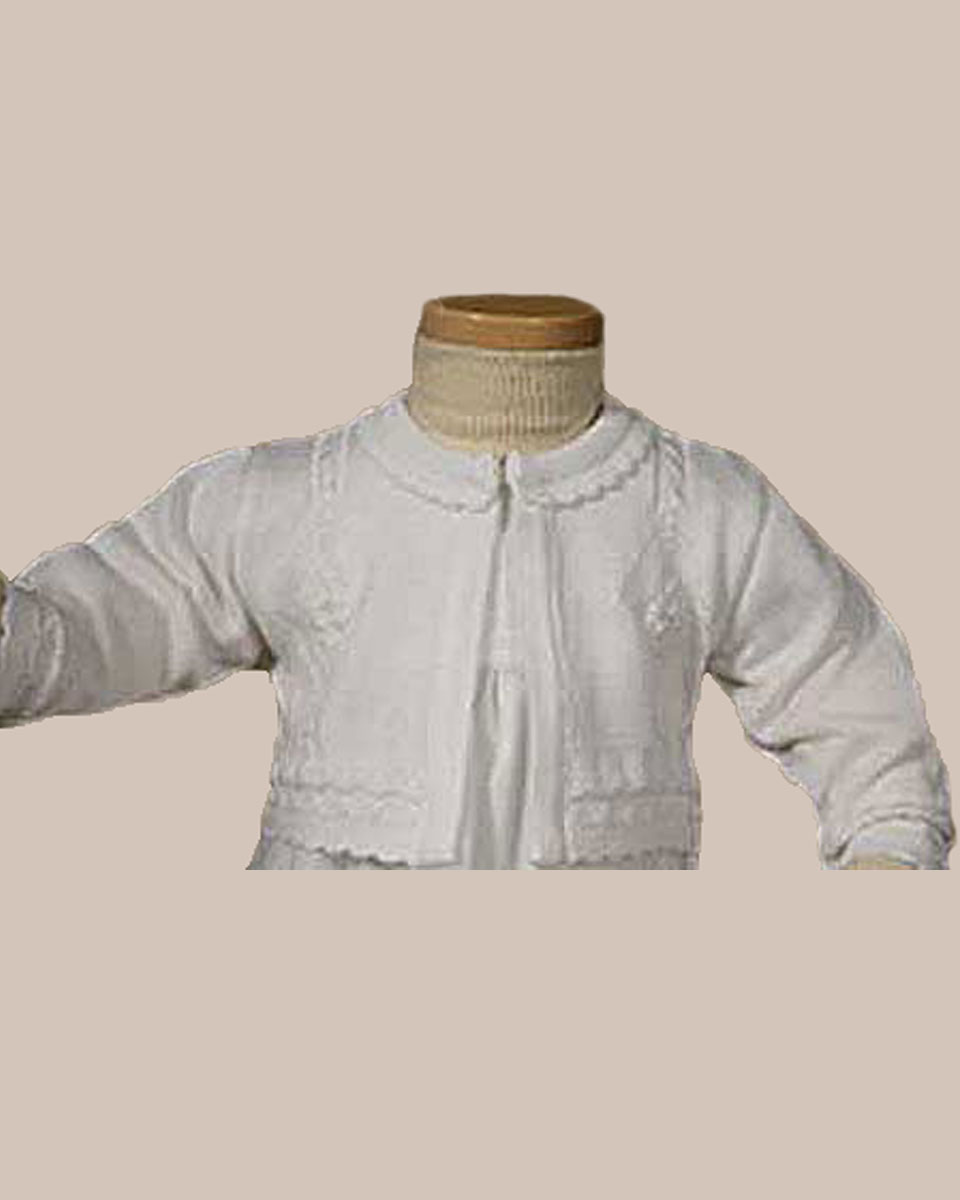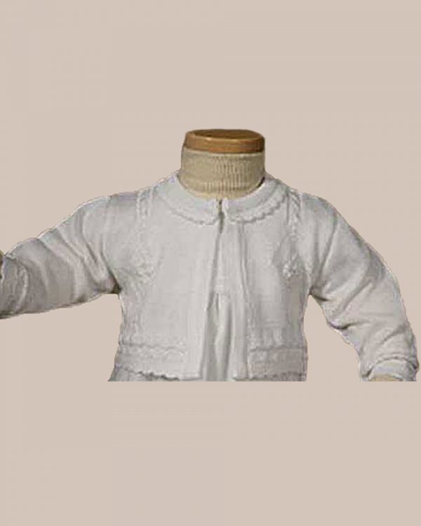 This 100% extra fine quality acrylic knit girls’ sweater is exquisitely finished to provide a soft, comfortable, and stylish fit. Features scalloped edging on the collar, sleeves, and waistline. A single button closure is located at the neck to add to the elegant style. Imported.  (CKGRLS)