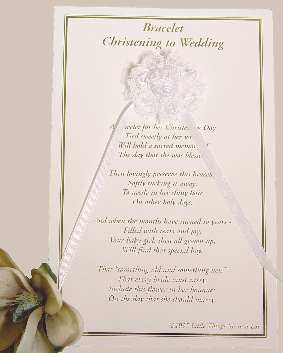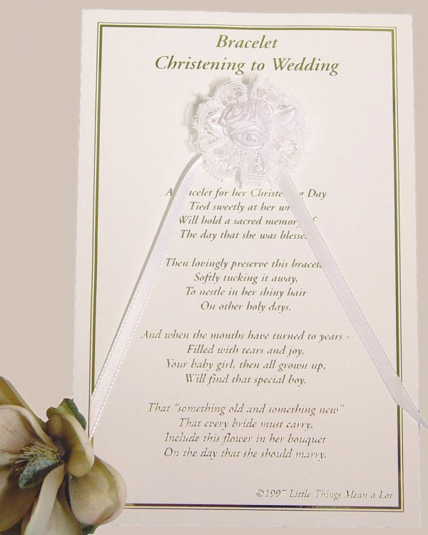 The perfect gift for the finishing touch to a Christening gown. This bracelet is tied at the wrist and may become part of a wedding bouquet or attached to a wedding garter in years to come. This item is packaged in a clear envelope with a sentimental poem explaining the concept printed in gold lettering on high gloss card stock. (ABRACE)