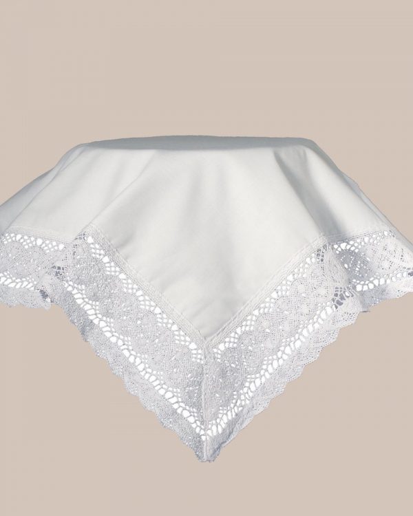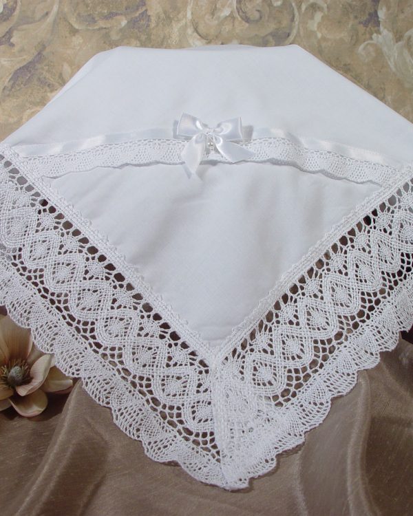 Cotton batiste blanket with wide cluny lace edge. Approximate size: 30″ x 40″.