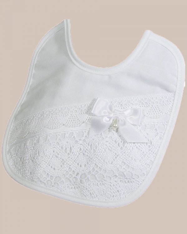 Cotton batiste bib, accented with cluny trim, ribbon bow. 100% Cotto,. backed with cotton flannel. Hand Wasable. Approximate size: 6.5″ x 6.5″. (CAC25XB)